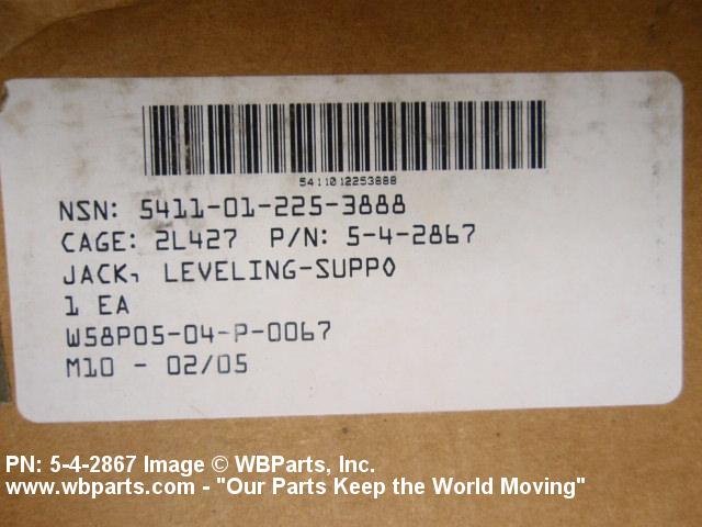 5120-01-274-0785 A device usually of single leg construction incorporating one of the various methods of jacking. The base end contacts the ground or floor, and the opposite end or upper portion has facilities for attaching to the item to be supported. It is used as an auxiliary support for leveling and/or preventing movement. Excludes JACK, LEVELING-SUPPORT GUIDED MISSILE ERECTOR-LAUNCHER; JACK, TRANSPORTABLE SHELTER; and SUPPORT, RETRACTABLE, SEMITRAILER. See also JACK (as modified).