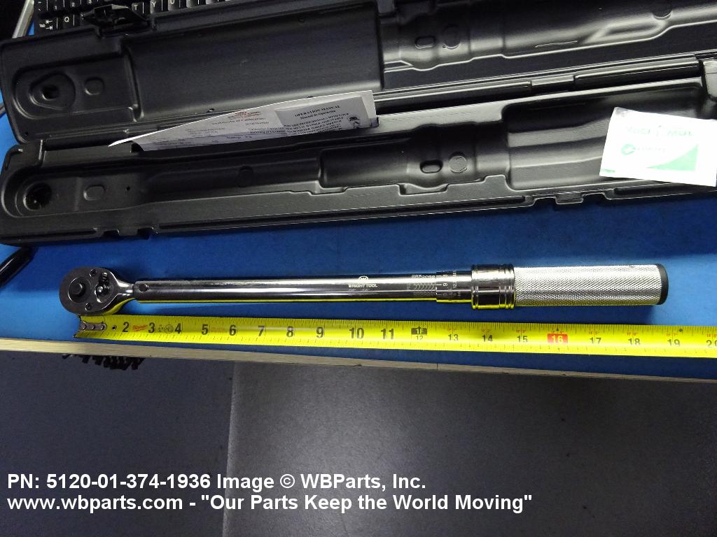 5120-01-374-1936 A manual tool for tightening various fasteners to a precise torque value. Consists of a handle and drive to accommodate female square drive sockets and other types of wrenching adapters. Torque value may be manually set and adjusted by user or may be provided as preset for production line use. A signaling device is generally provided to indicate when set torque value is reached. Handle is swung at right angle to axis of fastener rotation to apply torque. For items with handles that are spun in-line with axis of fastener rotation to apply torque, see SCREWDRIVER, TORQUE.2025120000065200043Dental Instruments, Equipment, and Supplies