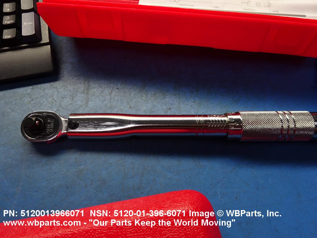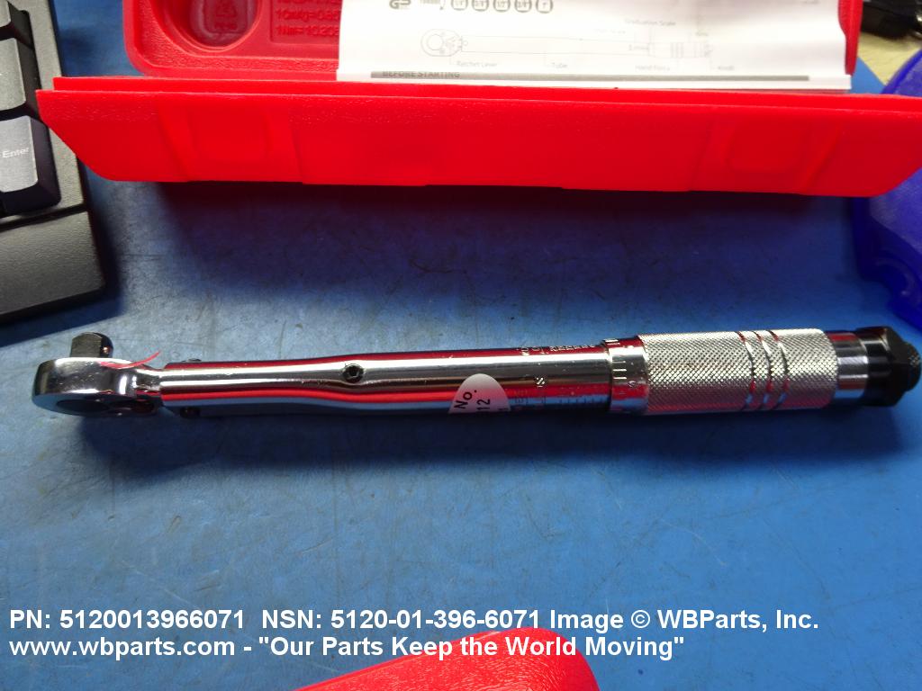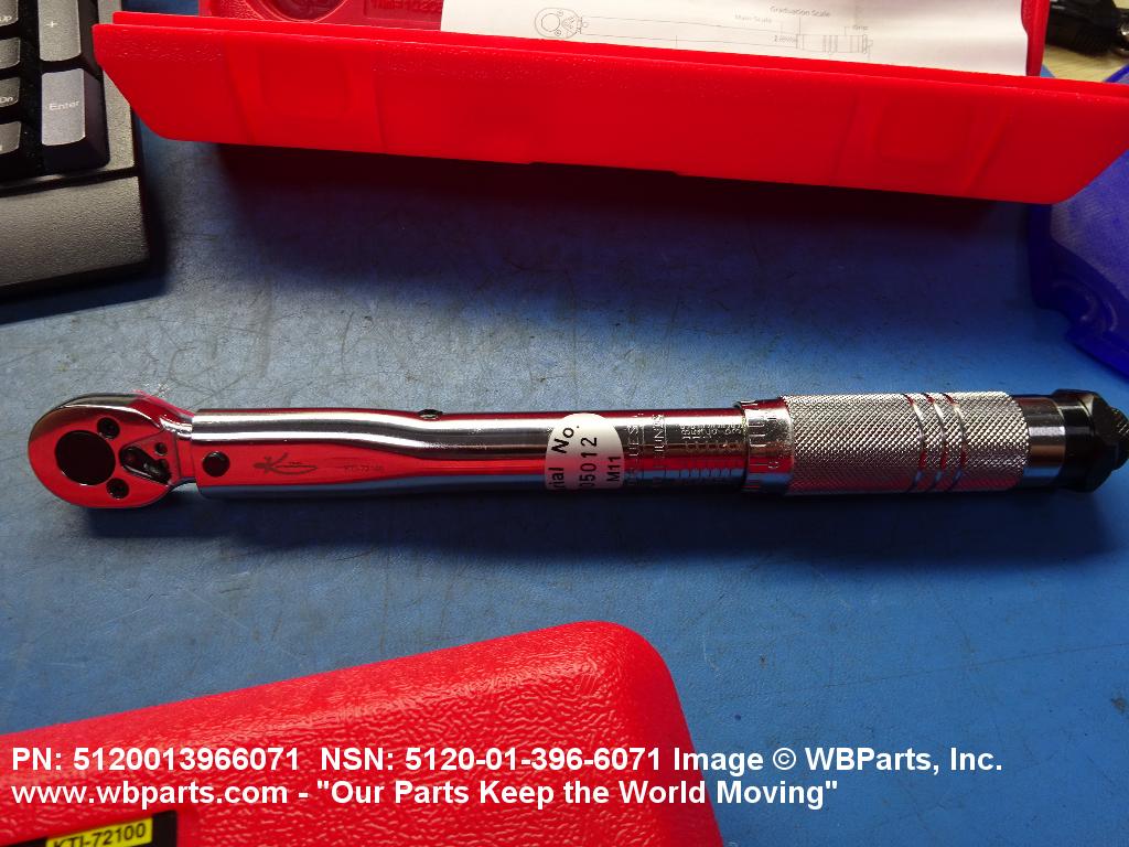 5120-01-396-6071 A manual tool for tightening various fasteners to a precise torque value. Consists of a handle and drive to accommodate female square drive sockets and other types of wrenching adapters. Torque value may be manually set and adjusted by user or may be provided as preset for production line use. A signaling device is generally provided to indicate when set torque value is reached. Handle is swung at right angle to axis of fastener rotation to apply torque. For items with handles that are spun in-line with axis of fastener rotation to apply torque, see SCREWDRIVER, TORQUE.2025120000065200043Dental Instruments, Equipment, and Supplies