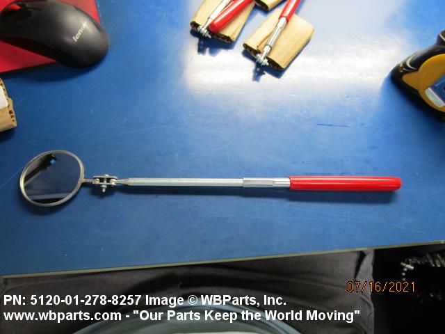 5120-01-399-9300 An item which has a mirror attached to one end of a rod in such a manner that it may be inserted past obstructions. The mirror can be fixed or adjustable and may or may not have locking facilities. The rod may be telescoping or flexible and/or equipped with an integrated light.