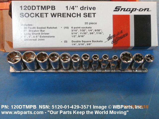 5120-01-429-3571 An assortment of various sizes of WRENCH, SOCKET and/or combinations of SOCKET, SOCKET WRENCH and HANDLE, SOCKET WRENCH. It may include related attachments such as ADAPTER, SOCKET WRENCH; EXTENSION, SOCKET WRENCH; BAR, SOCKET WRENCH HANDLE; RATCHET ATTACHMENT, SOCKET WRENCH; UNIVERSAL JOINT, SOCKET WRENCH and BIT, SCREWDRIVER.20251200032Hand Tools, Nonedged, Nonpowered51300024Hand Tools, Power Driven