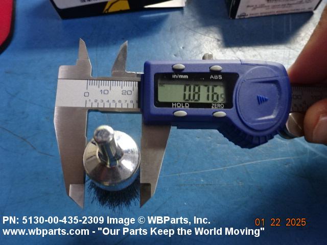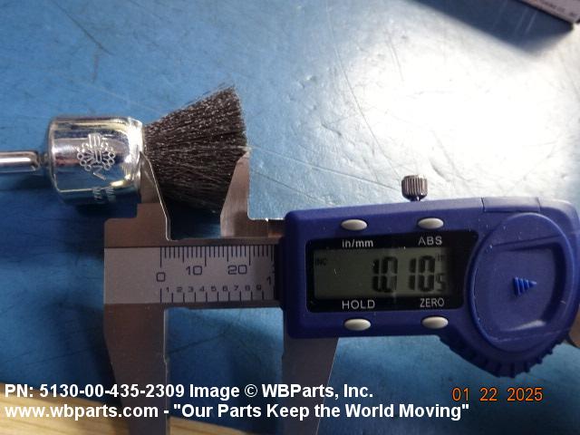 5130-00-435-2309 A brush having a circular wire fill section secured in a tubular back, and a 1/4 inch round shank drive. The fill material extends parallel or at right angles to the axis of its shank. It is used in a rotary, power-operated device for carbon removing, cleaning, smoothing and the like. See also BRUSH, WIRE, ROTARY CUP; and BRUSH, WIRE, ROTARY WHEEL.