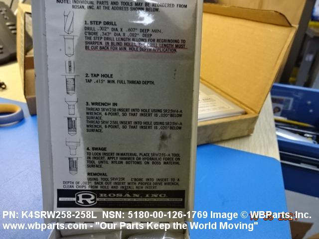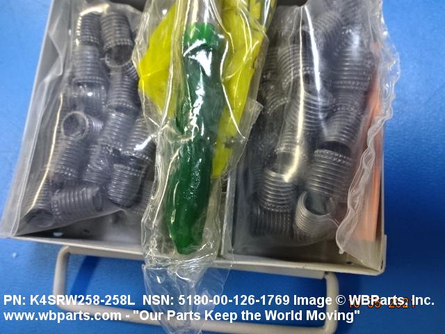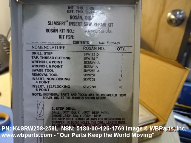 | NONSUPPLY ITEMS AND QUANTITIES | 83224 SRW 258 INSERT,SCREW THREAD 40;SRW 258L INSERT,SCREW THREAD 40;SRW 25D DRILL BIT 1;SRW 25T TAP,THREAD CUTTING 1;SR 25W4-A WRENCH,BOX 1;SR 25W-A WRENCH,BOX 1;SRW 25SA SWAGE TOOL,INSERT 1;SRW 25R EXTRACTOR,SCREW THREAD INSERT 1;81348 GGG-T-558/9 TY11SZ4 TOOL BOX,PORTABLE 1 |