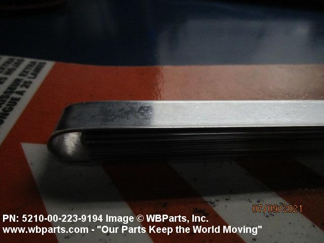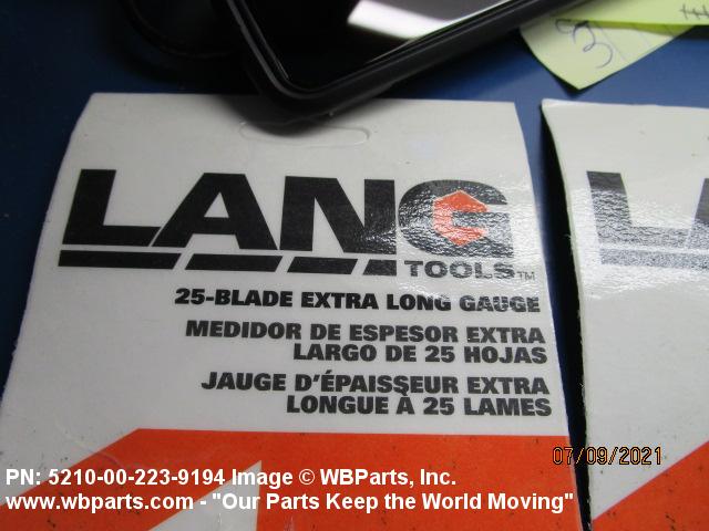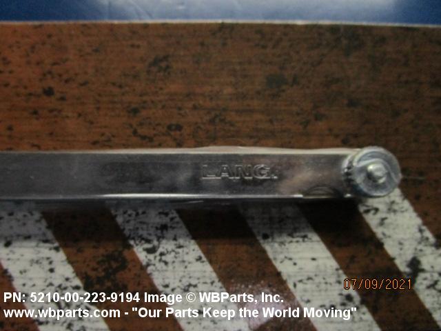 5210-00-223-9194 One or more tempered steel blades (leaves) ground to and marked with their respective thickness and mounted in a holder or encased within a frame or case into which the leaves fold. It is used for checking narrow slots or gaging the clearance between fitted parts. Excludes BLADE, THICKNESS GAGE. See also GAGE, GAP SETTING.