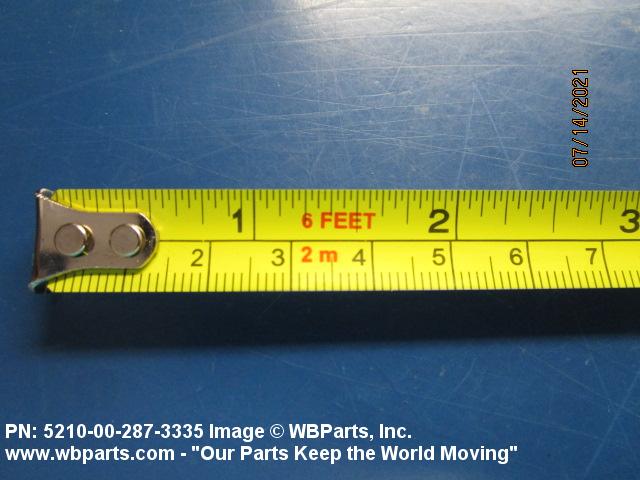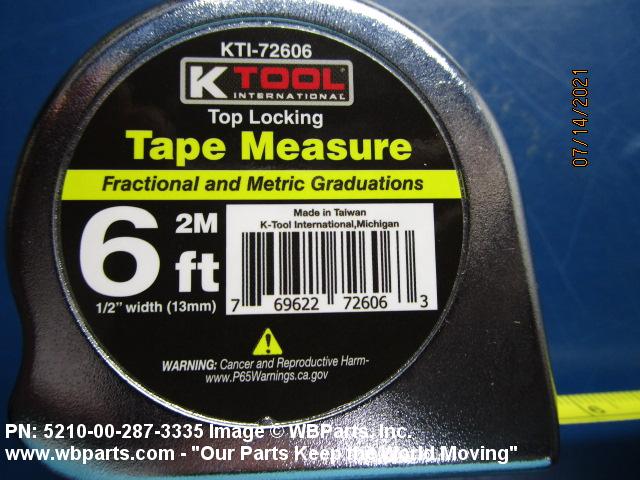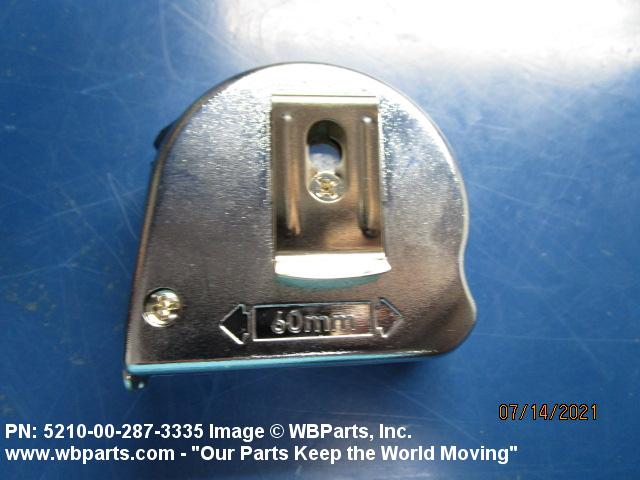 5210-00-287-3335 A narrow strip of flexible material graduated with markings to indicate a specific type of measure such as arithmetic, geometric, metric, or the like. All tapes are used principally in measuring distances and dimensions too long to be measured by a ruler, are usually enclosed into a case with accommodations for rewinding and may or may not have a ring at one end. Includes dressmaker tapes to heavy-duty types sometimes called surveyor's chains, usually mounted in reels with holding handles.