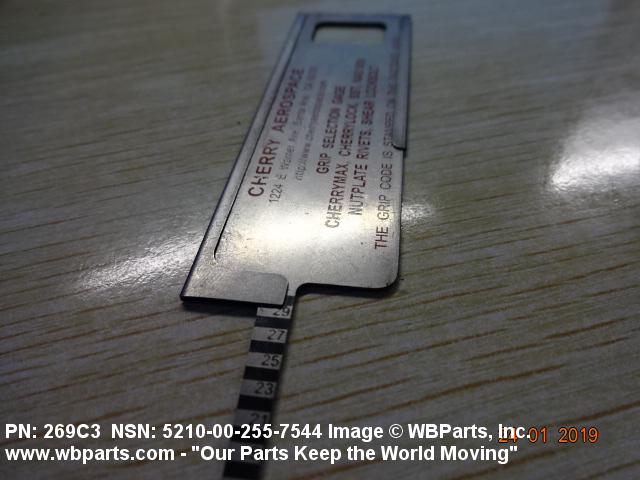 5210-00-620-1261 A measuring tool used to determine the thickness of material, rivet diameter required, and the grip length. It consists of a thin rectangular brass reference plate, a steel slide with a hook and a brass spacer.