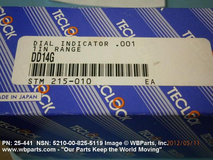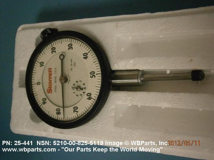 5210-00-825-5119 A mechanism for amplifying and measuring the displacement of a movable contact point, thereby measuring a dimension or variation from a standard dimension. It consists essentially of a case with means for mounting the indicator, a spindle carrying the contact point, an amplifying mechanism, a pointer and a graduated dial. May include accessories and/or attachments. Excludes INDICATOR, SCALE. See also GAGE, DEPTH, DIAL INDICATING.