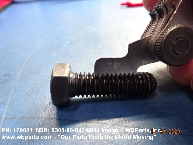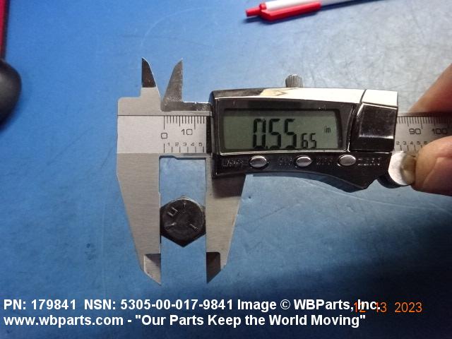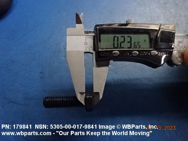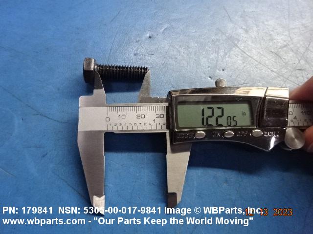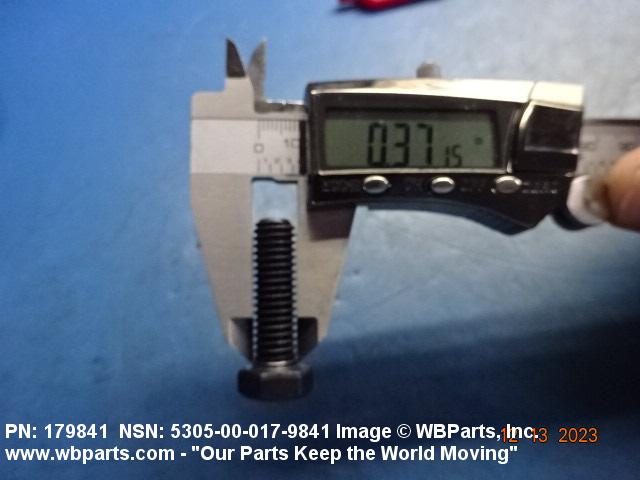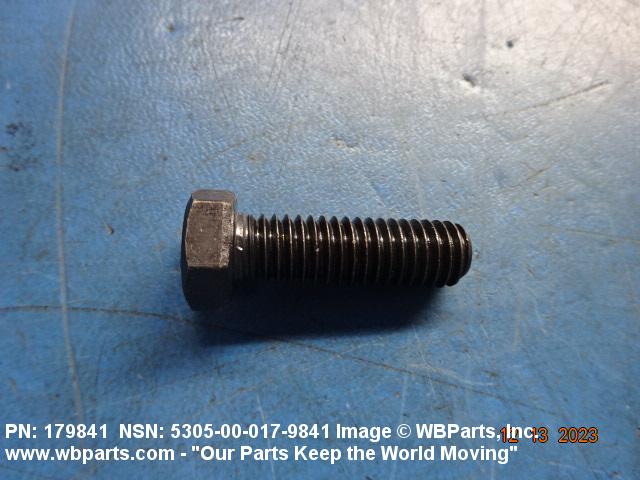 5305-00-017-9841 An externally threaded fastener designed for insertion into holes in assembled parts, for mating with a preformed internal thread and for tightening or releasing by torquing the head. The threaded and unthreaded portions are both of the same nominal diameter of 0.190 inch (5 mm) or larger. Head dimensions and sizes of threaded and unthreaded portions shall conform to internationally recognized fastener standards. The thread length being the controlled dimension, the grip length is not specified. A locking feature may be incorporated in the design of the head or threads. The head is not designed to be held or driven with an inserted driver or by the thumb and fingers. Excludes BOLT,MACHINE; BOLT,EXTERNALLY RELIEVED BODY; BOLT,INTERNAL WRENCHING; and SCREW,CAP,SOCKET HEAD.