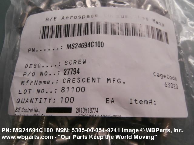 | MS24694C100 | 80205 | NATIONAL AEROSPACE STANDARDS COMMITTEE AEROSPACE INDUSTRIES |