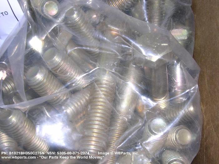 5305-00-071-2074 An externally threaded fastener designed for insertion into holes in assembled parts, for mating with a preformed internal thread and for tightening or releasing by torquing the head. The threaded and unthreaded portions are both of the same nominal diameter of 0.190 inch (5 mm) or larger. Head dimensions and sizes of threaded and unthreaded portions shall conform to internationally recognized fastener standards. The thread length being the controlled dimension, the grip length is not specified. A locking feature may be incorporated in the design of the head or threads. The head is not designed to be held or driven with an inserted driver or by the thumb and fingers. Excludes BOLT,MACHINE; BOLT,EXTERNALLY RELIEVED BODY; BOLT,INTERNAL WRENCHING; and SCREW,CAP,SOCKET HEAD.