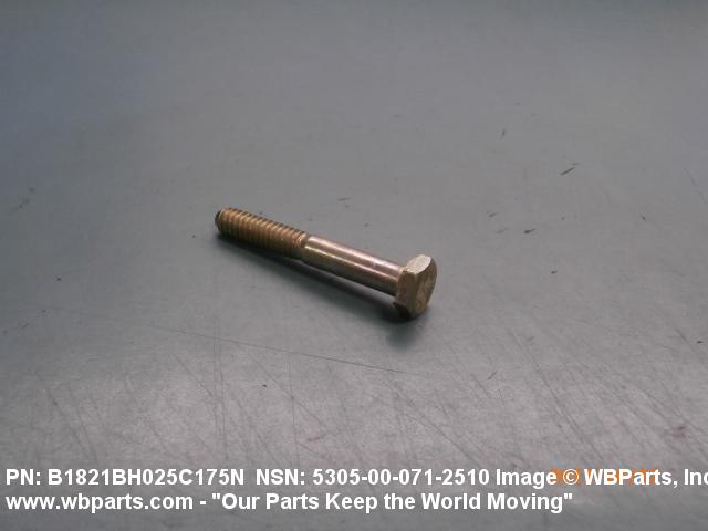 5305-00-071-2510 An externally threaded fastener designed for insertion into holes in assembled parts, for mating with a preformed internal thread and for tightening or releasing by torquing the head. The threaded and unthreaded portions are both of the same nominal diameter of 0.190 inch (5 mm) or larger. Head dimensions and sizes of threaded and unthreaded portions shall conform to internationally recognized fastener standards. The thread length being the controlled dimension, the grip length is not specified. A locking feature may be incorporated in the design of the head or threads. The head is not designed to be held or driven with an inserted driver or by the thumb and fingers. Excludes BOLT,MACHINE; BOLT,EXTERNALLY RELIEVED BODY; BOLT,INTERNAL WRENCHING; and SCREW,CAP,SOCKET HEAD.