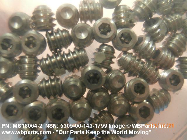 5305-00-143-1799 An externally threaded device whose threaded portion is of one nominal diameter with or without a head and having a cup, cone, or other type of machined point designed to prevent or restrict relative movement of parts and designed to be driven with either a wrench or inserted driver. A locking feature may be incorporated in the design of the head or threads.