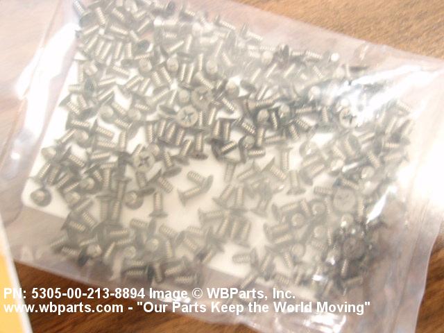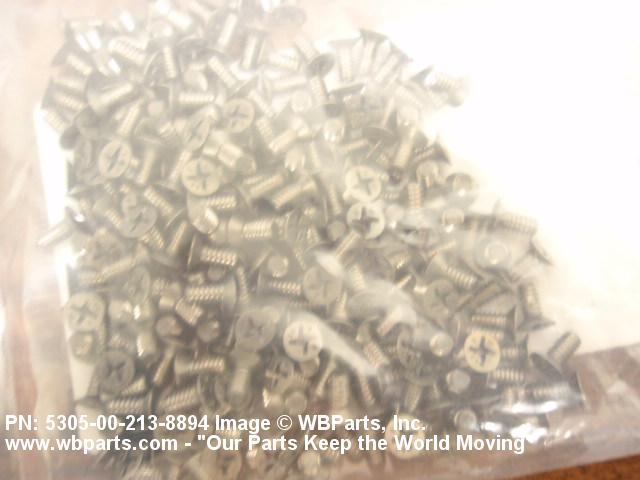 5305-00-213-8894 An externally threaded fastener whose threaded portion is of one nominal diameter, No 0 (0.060 in./1.5 mm) or larger, designed to be held or driven with either a wrench or an inserted driver or both (excluding internal socket or internal multiple spline types), in sizes below No. 10 (0.190 in./5 mm). No. 10 and larger sizes must have a head designed for any type inserted driver (excluding internal socket or internal multiple spline types), but may also be designed for external wrenching. A locking feature may be incorporated in the design of the head or threads. Excludes BOLT, CLEVIS; BOLT, EXTERNALLY RELIEVED BODY; SCREW, EXTERNALLY RELIEVED BODY; and SCREW, ASSEMBLED WASHER. See also, SCREW, INSTRUMENT; BOLT, MACHINE; BOLT, INTERNAL WRENCHING; and SCREW, CAP SOCKET HEAD.