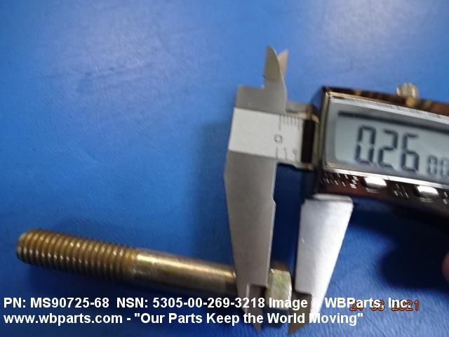 5305-00-269-3218 An externally threaded fastener designed for insertion into holes in assembled parts, for mating with a preformed internal thread and for tightening or releasing by torquing the head. The threaded and unthreaded portions are both of the same nominal diameter of 0.190 inch (5 mm) or larger. Head dimensions and sizes of threaded and unthreaded portions shall conform to internationally recognized fastener standards. The thread length being the controlled dimension, the grip length is not specified. A locking feature may be incorporated in the design of the head or threads. The head is not designed to be held or driven with an inserted driver or by the thumb and fingers. Excludes BOLT,MACHINE; BOLT,EXTERNALLY RELIEVED BODY; BOLT,INTERNAL WRENCHING; and SCREW,CAP,SOCKET HEAD.