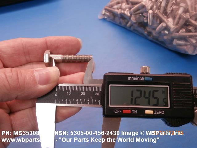 5305-00-456-2430 An externally threaded fastener designed for insertion into holes in assembled parts, for mating with a preformed internal thread and for tightening or releasing by torquing the head. The threaded and unthreaded portions are both of the same nominal diameter of 0.190 inch (5 mm) or larger. Head dimensions and sizes of threaded and unthreaded portions shall conform to internationally recognized fastener standards. The thread length being the controlled dimension, the grip length is not specified. A locking feature may be incorporated in the design of the head or threads. The head is not designed to be held or driven with an inserted driver or by the thumb and fingers. Excludes BOLT,MACHINE; BOLT,EXTERNALLY RELIEVED BODY; BOLT,INTERNAL WRENCHING; and SCREW,CAP,SOCKET HEAD.