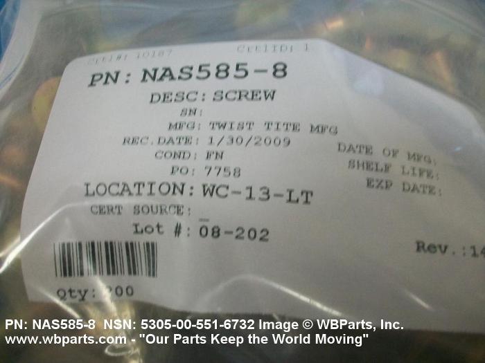 | NAS585-8T | 80205 | NATIONAL AEROSPACE STANDARDS COMMITTEE AEROSPACE INDUSTRIES |