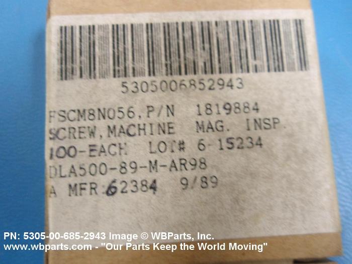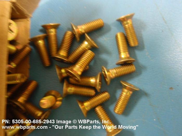 5305-00-685-2943 An externally threaded fastener whose threaded portion is of one nominal diameter, No 0 (0.060 in./1.5 mm) or larger, designed to be held or driven with either a wrench or an inserted driver or both (excluding internal socket or internal multiple spline types), in sizes below No. 10 (0.190 in./5 mm). No. 10 and larger sizes must have a head designed for any type inserted driver (excluding internal socket or internal multiple spline types), but may also be designed for external wrenching. A locking feature may be incorporated in the design of the head or threads. Excludes BOLT, CLEVIS; BOLT, EXTERNALLY RELIEVED BODY; SCREW, EXTERNALLY RELIEVED BODY; and SCREW, ASSEMBLED WASHER. See also, SCREW, INSTRUMENT; BOLT, MACHINE; BOLT, INTERNAL WRENCHING; and SCREW, CAP SOCKET HEAD.