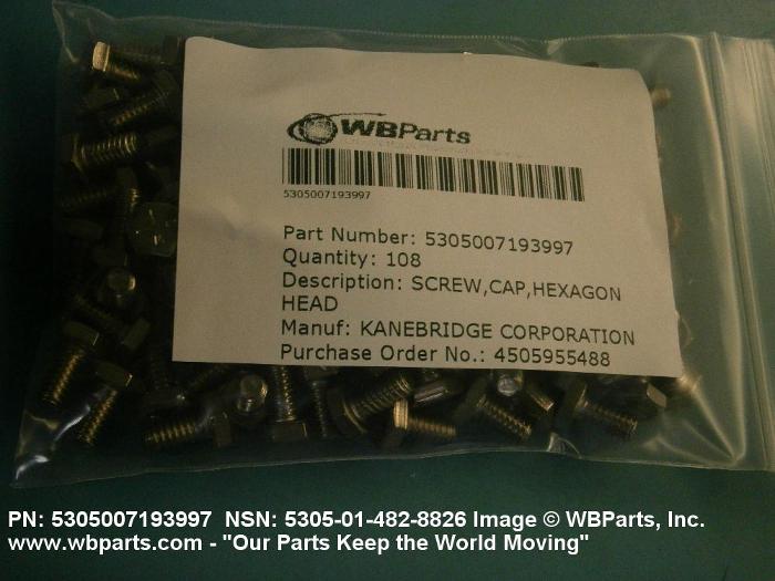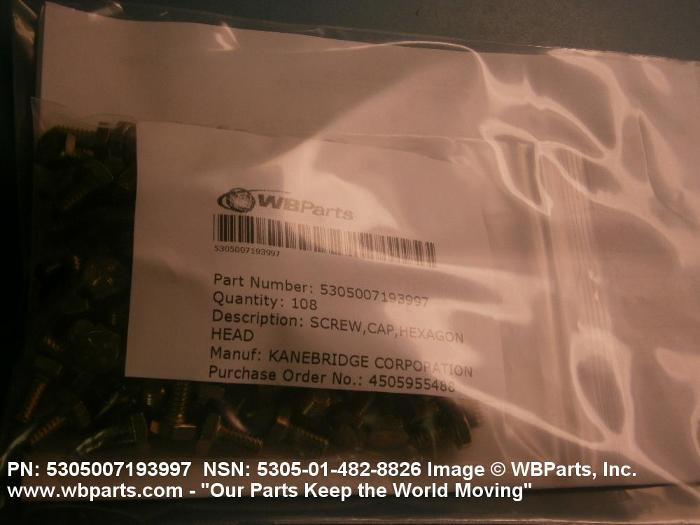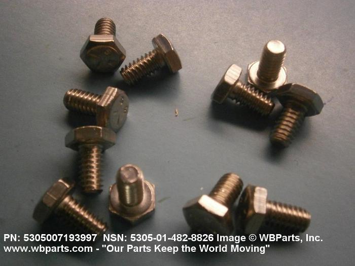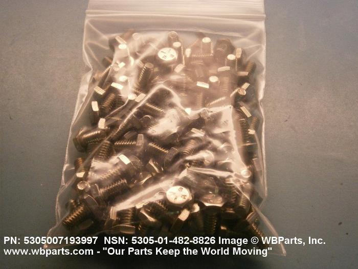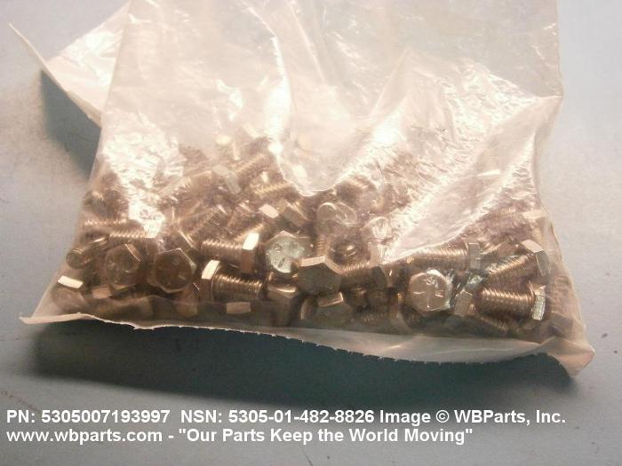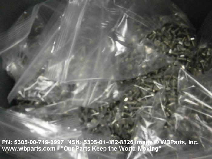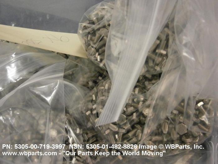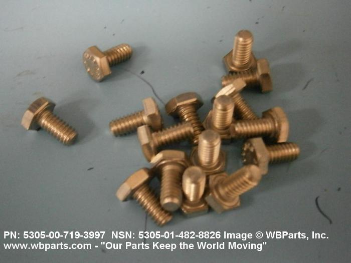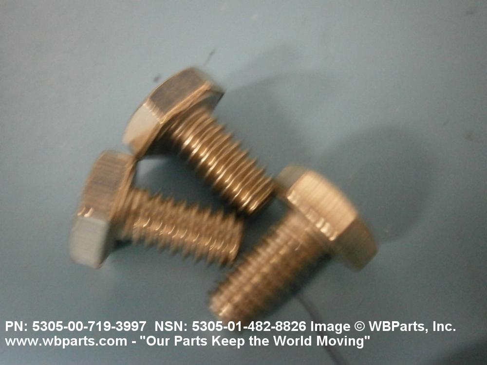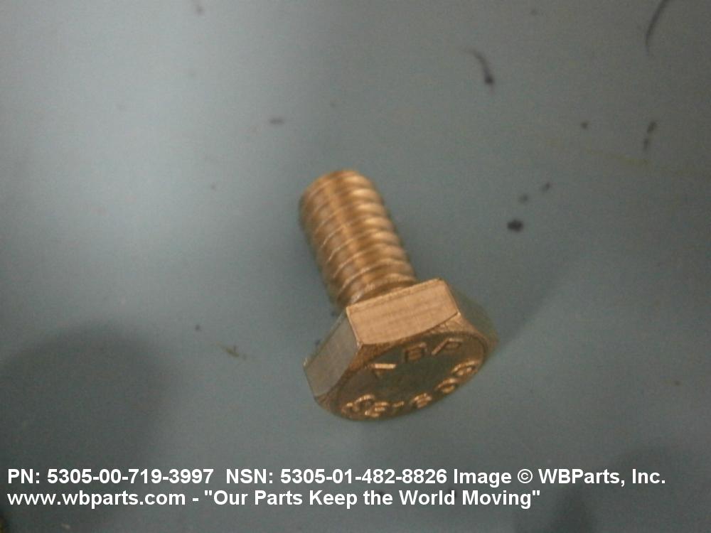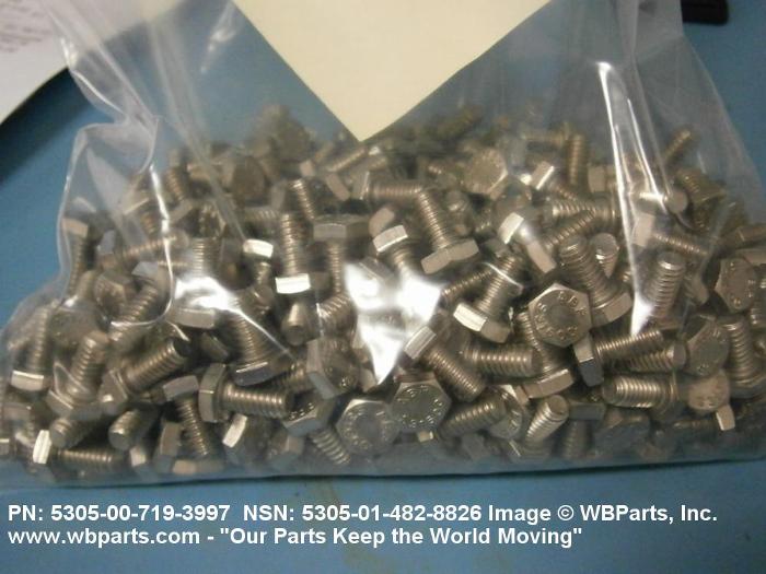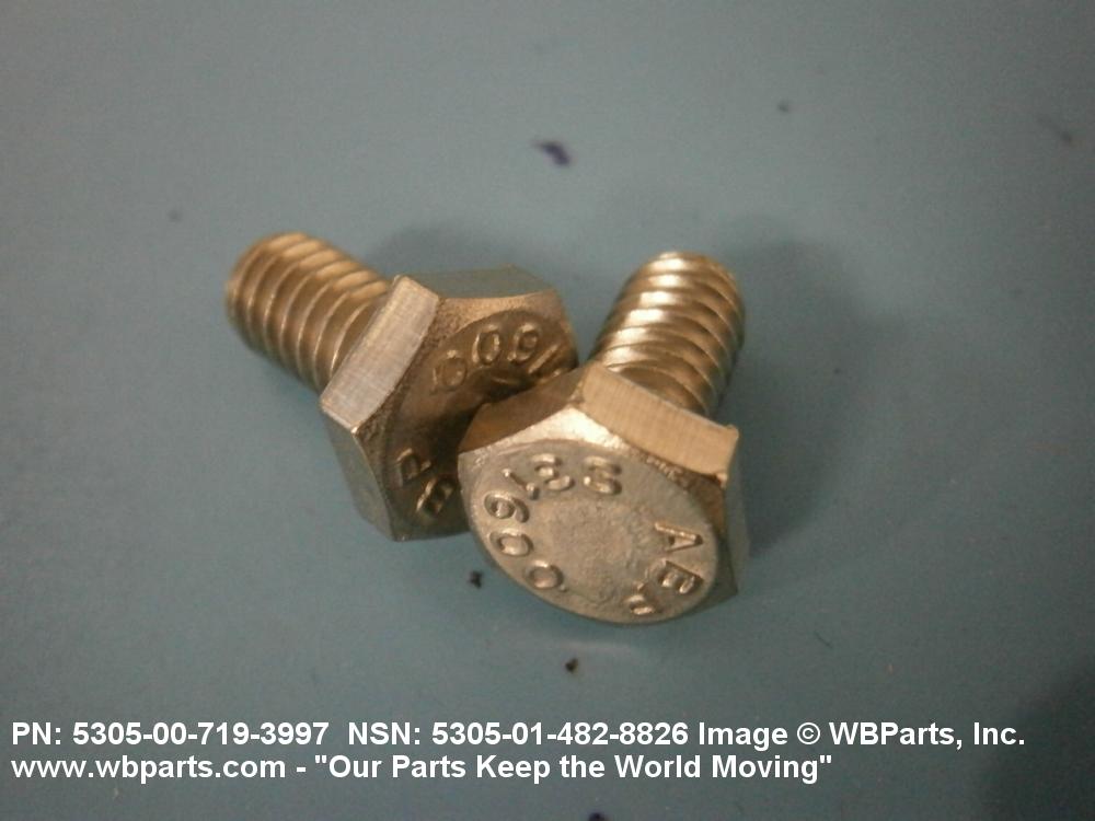 5305-00-719-3997 An externally threaded fastener designed for insertion into holes in assembled parts, for mating with a preformed internal thread and for tightening or releasing by torquing the head. The threaded and unthreaded portions are both of the same nominal diameter of 0.190 inch (5 mm) or larger. Head dimensions and sizes of threaded and unthreaded portions shall conform to internationally recognized fastener standards. The thread length being the controlled dimension, the grip length is not specified. A locking feature may be incorporated in the design of the head or threads. The head is not designed to be held or driven with an inserted driver or by the thumb and fingers. Excludes BOLT,MACHINE; BOLT,EXTERNALLY RELIEVED BODY; BOLT,INTERNAL WRENCHING; and SCREW,CAP,SOCKET HEAD.