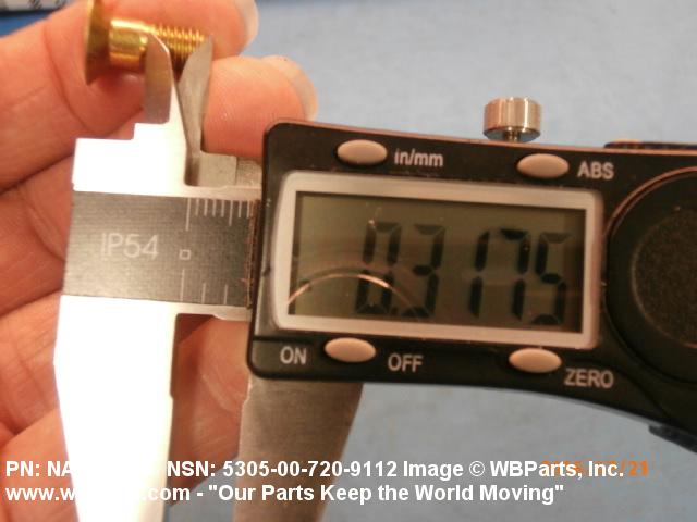 5305-00-720-9112 A SCREW, MACHINE or SCREW, CAP, SOCKET HEAD whose unthreaded portion is of specified grip length, plated or unplated, and is machined to a tolerance of one thousandth (0.001 IN.) (0.025 mm) or less of a specific diameter for items (1.000 IN.) (25 mm) or less in diameter. Items over (1.000 IN.) (25 mm) in diameter shall have a tolerance of fifteen ten thousandths (0.0015 IN.) (0.038 mm) or less. The nominal major diameter of the threads shall be at least one thousandth (0.001 IN.) (0.025 mm) below the minimum shank diameter, but not below the minimum major diameter for applicable class of fit, as shown in the Screw Thread Standards, FED STD H28 and/or other nationally recognized standards. The head is designed to be held or driven with an inserted driver. It is not designed for rotation by the thumb and fingers. A locking feature may be incorporated in the design of the head or threads.
