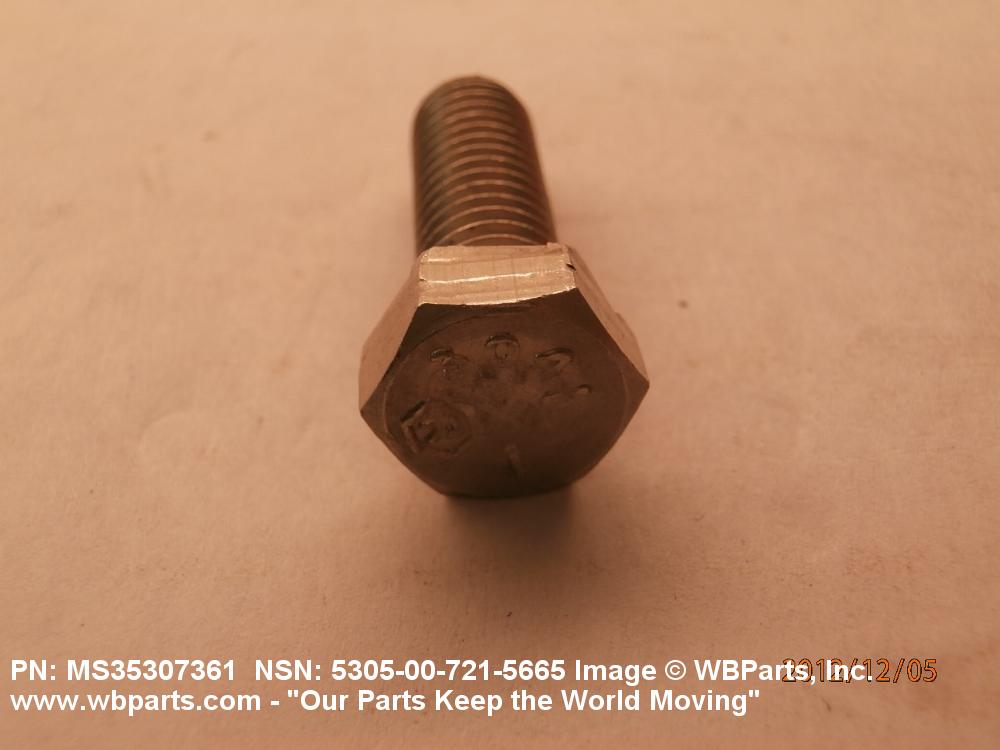 5305-00-721-5665 An externally threaded fastener designed for insertion into holes in assembled parts, for mating with a preformed internal thread and for tightening or releasing by torquing the head. The threaded and unthreaded portions are both of the same nominal diameter of 0.190 inch (5 mm) or larger. Head dimensions and sizes of threaded and unthreaded portions shall conform to internationally recognized fastener standards. The thread length being the controlled dimension, the grip length is not specified. A locking feature may be incorporated in the design of the head or threads. The head is not designed to be held or driven with an inserted driver or by the thumb and fingers. Excludes BOLT,MACHINE; BOLT,EXTERNALLY RELIEVED BODY; BOLT,INTERNAL WRENCHING; and SCREW,CAP,SOCKET HEAD.