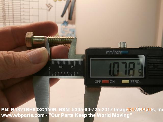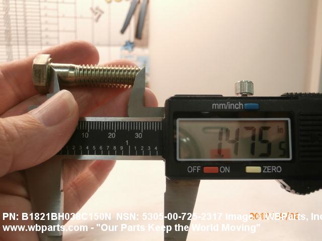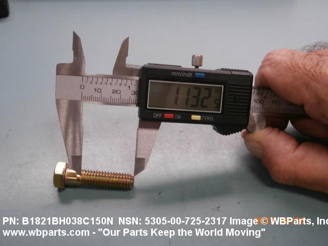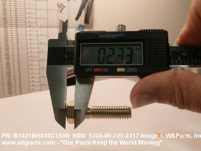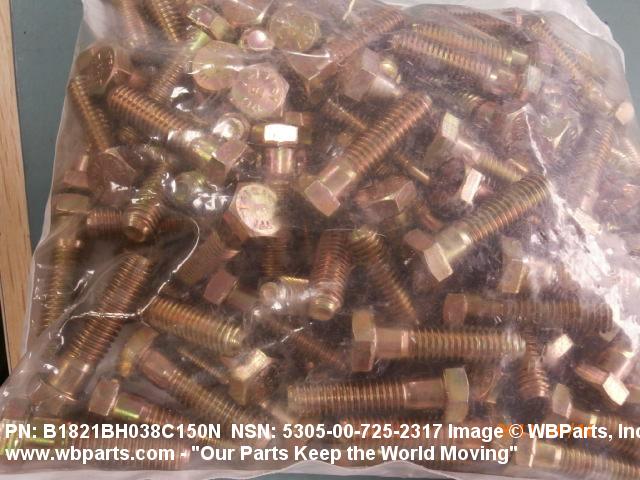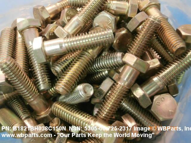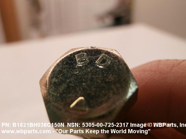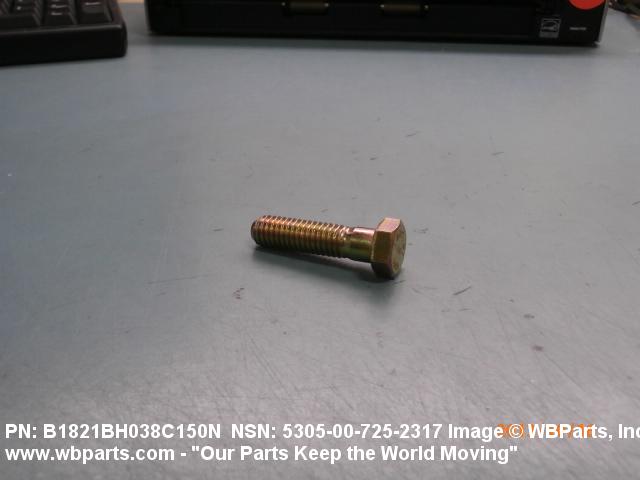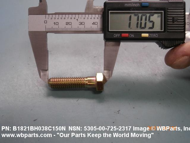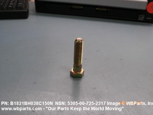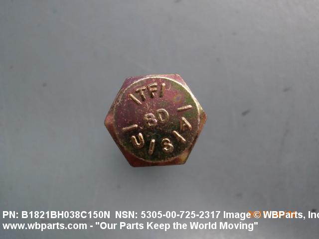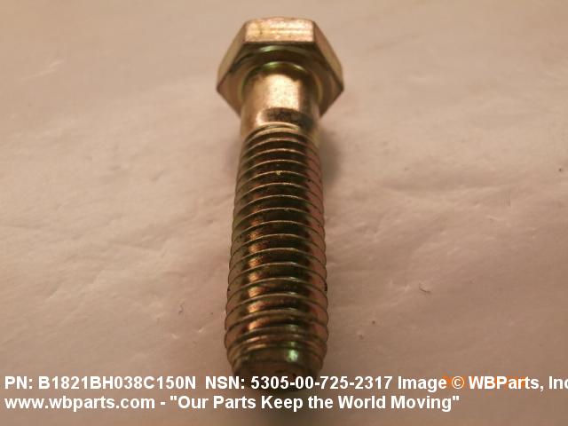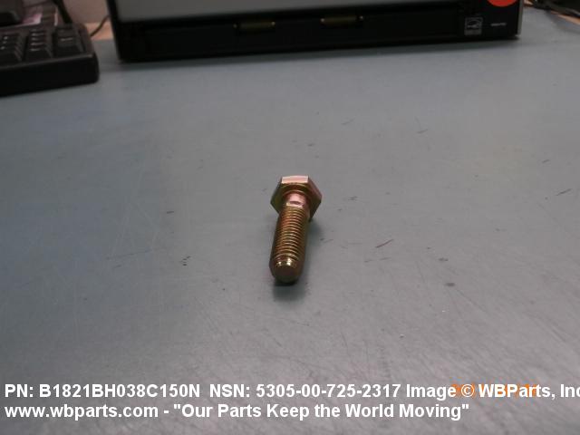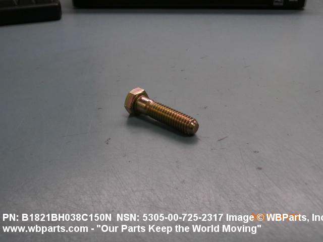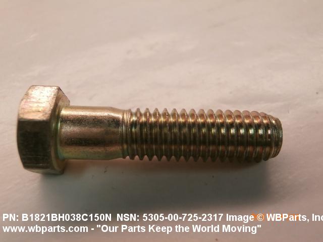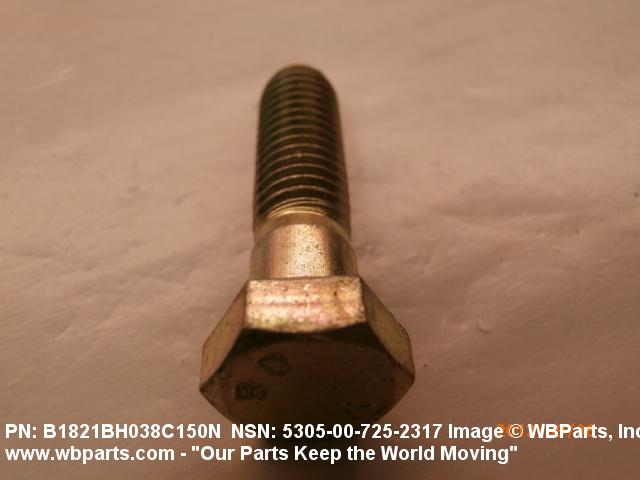 5305-00-725-2317 An externally threaded fastener designed for insertion into holes in assembled parts, for mating with a preformed internal thread and for tightening or releasing by torquing the head. The threaded and unthreaded portions are both of the same nominal diameter of 0.190 inch (5 mm) or larger. Head dimensions and sizes of threaded and unthreaded portions shall conform to internationally recognized fastener standards. The thread length being the controlled dimension, the grip length is not specified. A locking feature may be incorporated in the design of the head or threads. The head is not designed to be held or driven with an inserted driver or by the thumb and fingers. Excludes BOLT,MACHINE; BOLT,EXTERNALLY RELIEVED BODY; BOLT,INTERNAL WRENCHING; and SCREW,CAP,SOCKET HEAD.
