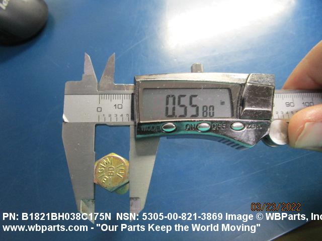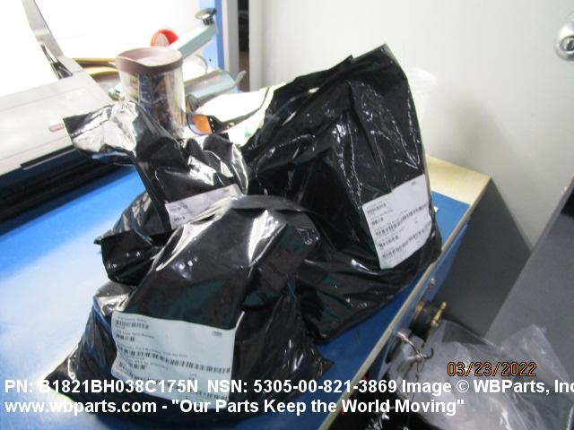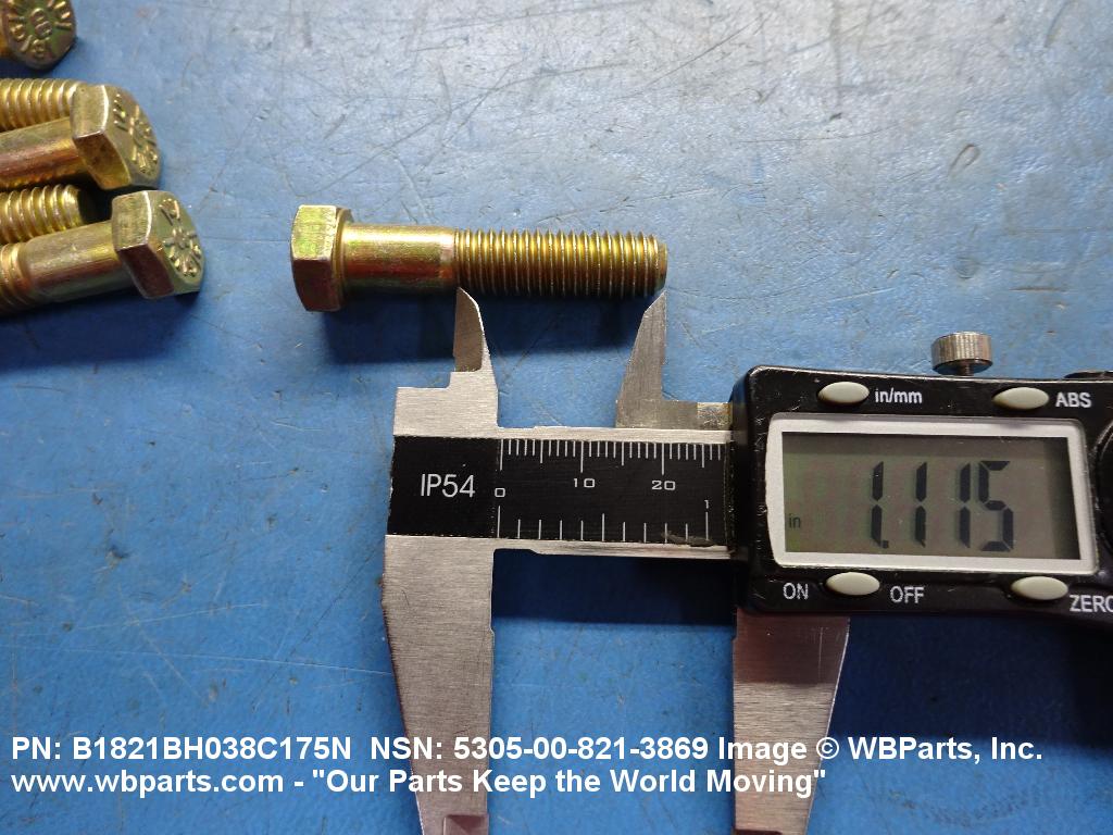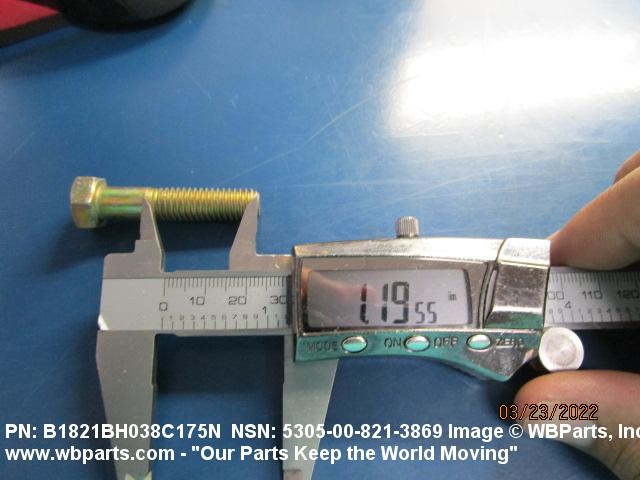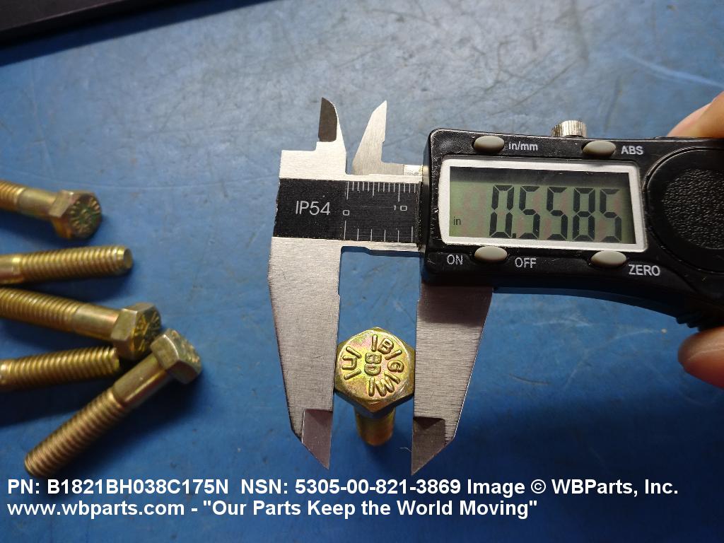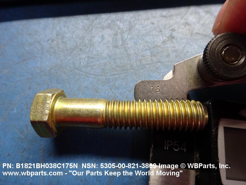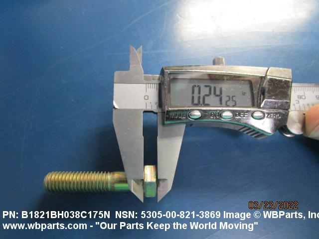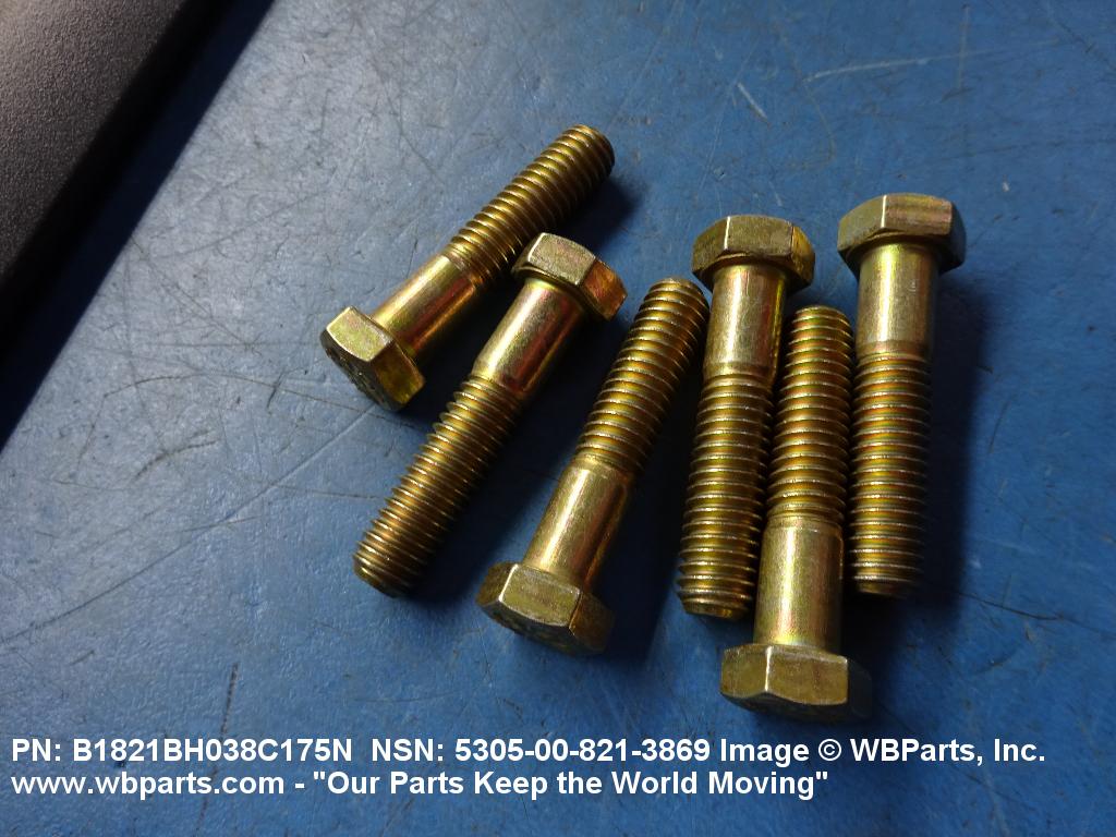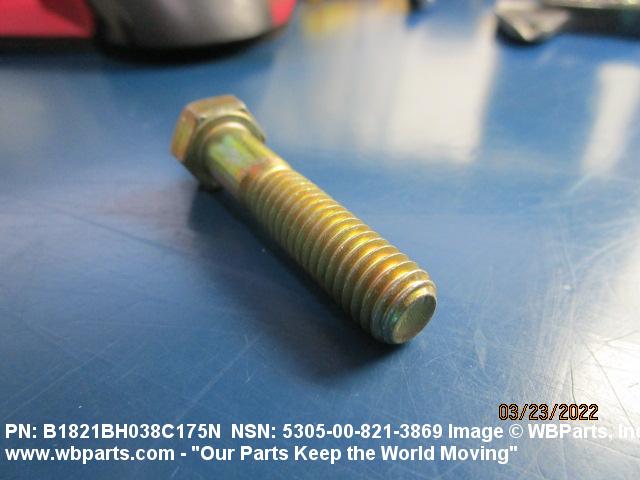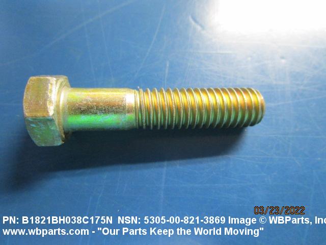 5305-00-821-3869 An externally threaded fastener designed for insertion into holes in assembled parts, for mating with a preformed internal thread and for tightening or releasing by torquing the head. The threaded and unthreaded portions are both of the same nominal diameter of 0.190 inch (5 mm) or larger. Head dimensions and sizes of threaded and unthreaded portions shall conform to internationally recognized fastener standards. The thread length being the controlled dimension, the grip length is not specified. A locking feature may be incorporated in the design of the head or threads. The head is not designed to be held or driven with an inserted driver or by the thumb and fingers. Excludes BOLT,MACHINE; BOLT,EXTERNALLY RELIEVED BODY; BOLT,INTERNAL WRENCHING; and SCREW,CAP,SOCKET HEAD.