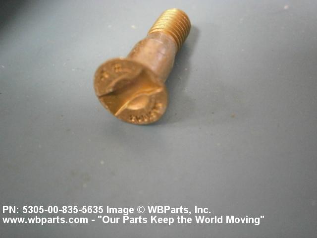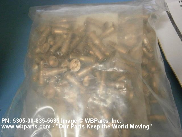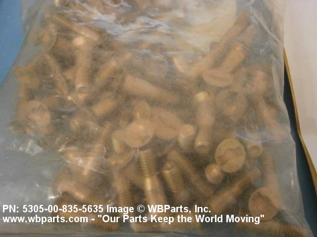 5305-00-835-5635 An externally threaded fastener whose threaded portion is of one nominal diameter, No 0 (0.060 IN.) (1.5 mm) or larger. It has a round unthreaded neck or shank all or part of which is of greater diameter than the threaded portion. The head is designed to be driven with either a wrench or an inserted driver or both in sizes below No. 10 (0.190 IN.) (5 mm) nominal diameter. No. 10 (0.190 IN.) (5 mm) and larger sizes must be designed for any type of inserted driver, but may also provide for external wrenching of the head. A locking feature may be incorporated in the design of the head or threads. For items which are both shouldered and have an externally relieved body, use SCREW, EXTERNALLY RELIEVED BODY. For items with a No. 10 (0.190 IN.) (5 mm) or larger thread diameter without an inserted driver head, use BOLT, SHOULDER. Excludes BOLT, INTERNAL WRENCHING and SCREW, CAP, SOCKET HEAD.
