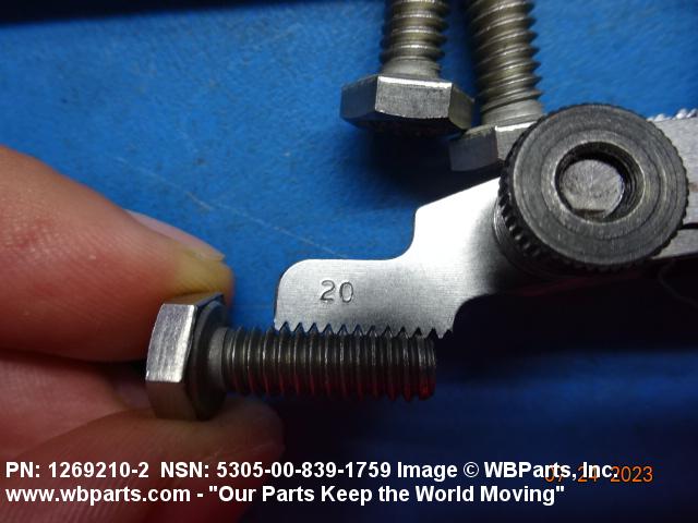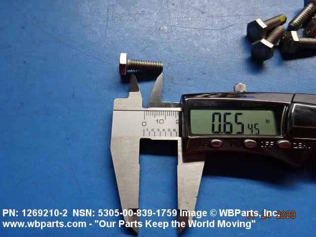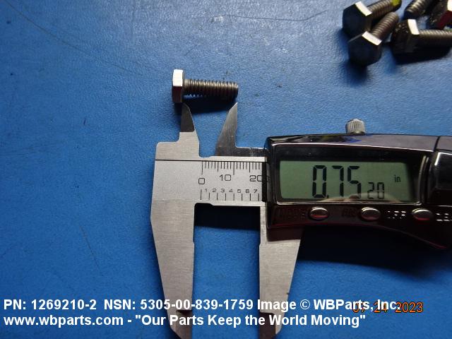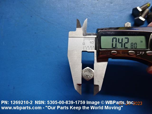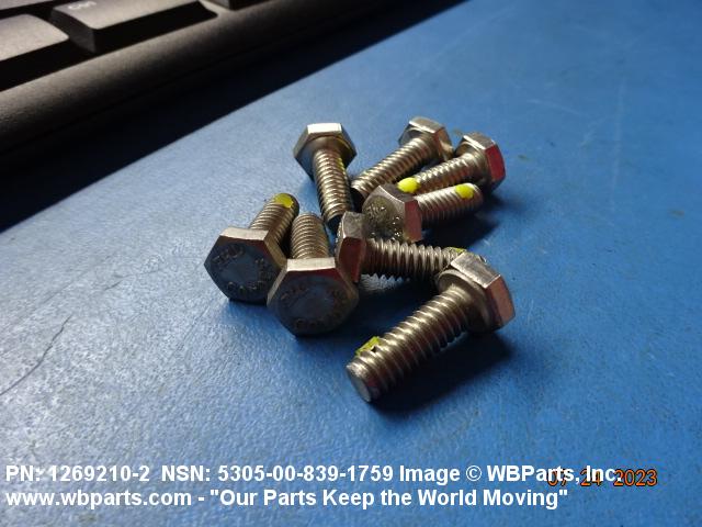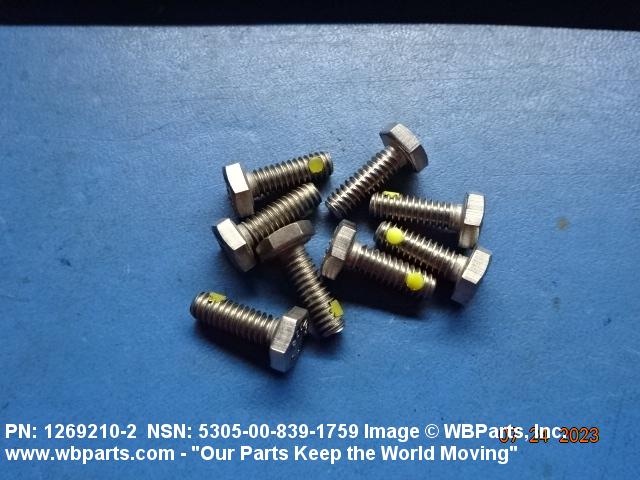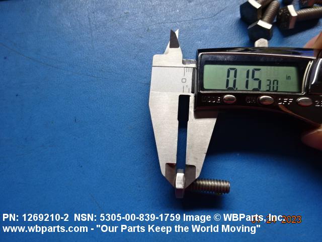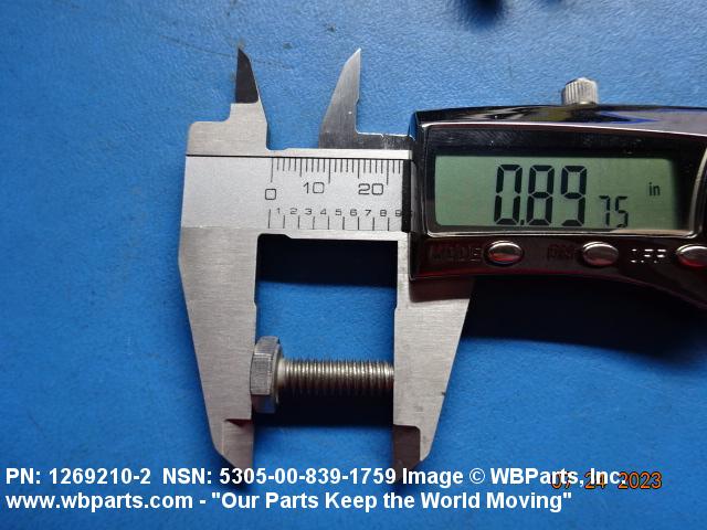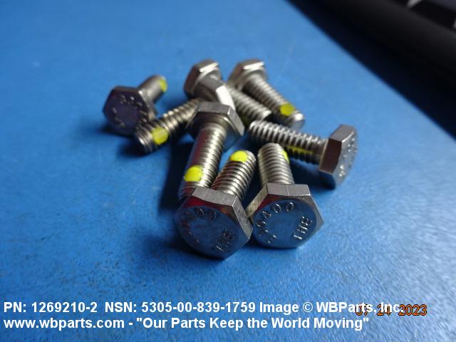 5305-00-839-1759 An externally threaded fastener designed for insertion into holes in assembled parts, for mating with a preformed internal thread and for tightening or releasing by torquing the head. The threaded and unthreaded portions are both of the same nominal diameter of 0.190 inch (5 mm) or larger. Head dimensions and sizes of threaded and unthreaded portions shall conform to internationally recognized fastener standards. The thread length being the controlled dimension, the grip length is not specified. A locking feature may be incorporated in the design of the head or threads. The head is not designed to be held or driven with an inserted driver or by the thumb and fingers. Excludes BOLT,MACHINE; BOLT,EXTERNALLY RELIEVED BODY; BOLT,INTERNAL WRENCHING; and SCREW,CAP,SOCKET HEAD.