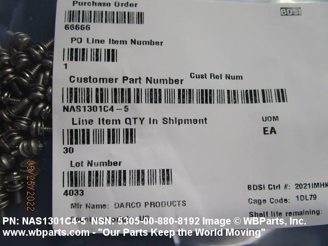 | NAS1301C4-5 | 80205 | NATIONAL AEROSPACE STANDARDS COMMITTEE AEROSPACE INDUSTRIES |