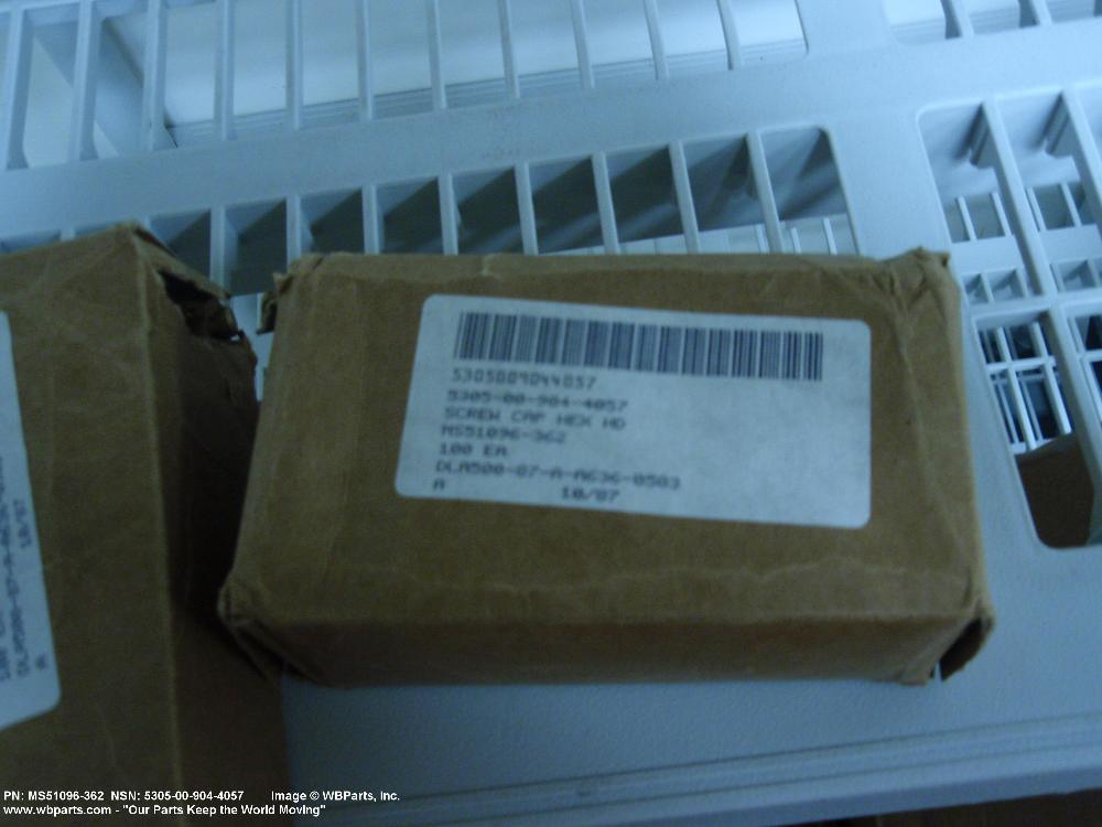 5305-00-904-4057 An externally threaded fastener designed for insertion into holes in assembled parts, for mating with a preformed internal thread and for tightening or releasing by torquing the head. The threaded and unthreaded portions are both of the same nominal diameter of 0.190 inch (5 mm) or larger. Head dimensions and sizes of threaded and unthreaded portions shall conform to internationally recognized fastener standards. The thread length being the controlled dimension, the grip length is not specified. A locking feature may be incorporated in the design of the head or threads. The head is not designed to be held or driven with an inserted driver or by the thumb and fingers. Excludes BOLT,MACHINE; BOLT,EXTERNALLY RELIEVED BODY; BOLT,INTERNAL WRENCHING; and SCREW,CAP,SOCKET HEAD.