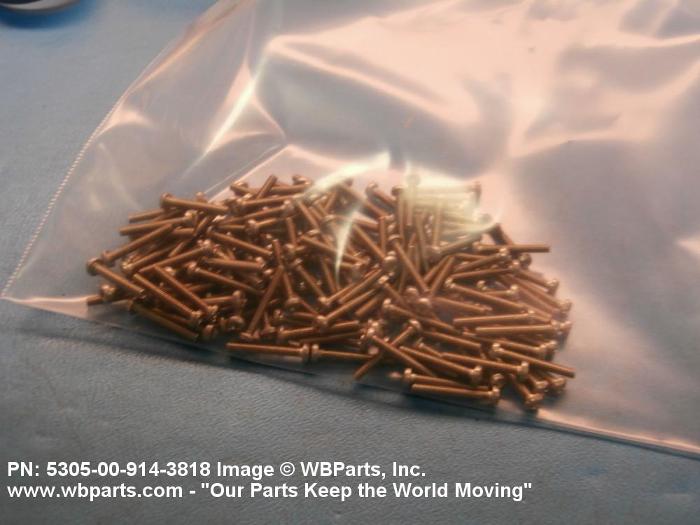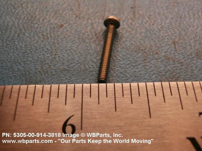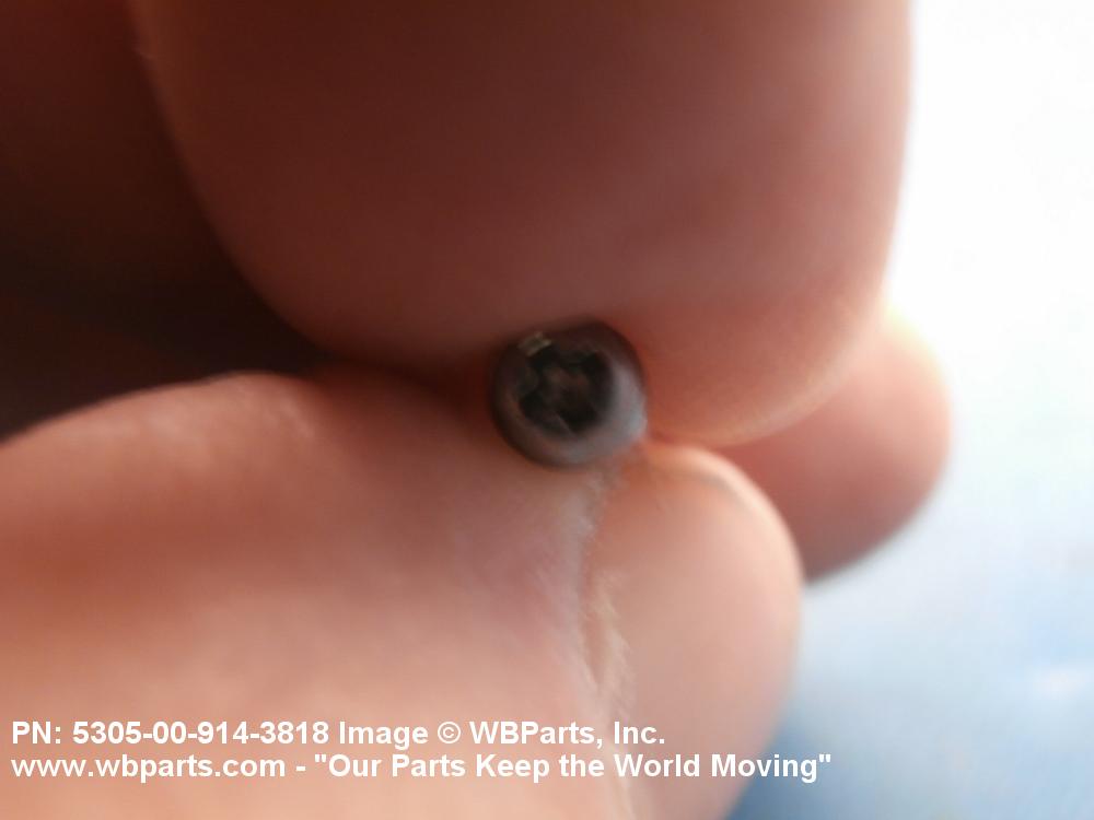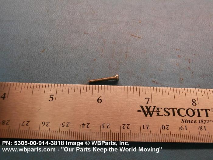 5305-00-914-3818 An externally threaded fastener whose threaded portion is of one nominal diameter, No 0 (0.060 IN.) (1.5 mm) or larger. It has a round unthreaded neck or shank all or part of which is of greater diameter than the threaded portion. The head is designed to be driven with either a wrench or an inserted driver or both in sizes below No. 10 (0.190 IN.) (5 mm) nominal diameter. No. 10 (0.190 IN.) (5 mm) and larger sizes must be designed for any type of inserted driver, but may also provide for external wrenching of the head. A locking feature may be incorporated in the design of the head or threads. For items which are both shouldered and have an externally relieved body, use SCREW, EXTERNALLY RELIEVED BODY. For items with a No. 10 (0.190 IN.) (5 mm) or larger thread diameter without an inserted driver head, use BOLT, SHOULDER. Excludes BOLT, INTERNAL WRENCHING and SCREW, CAP, SOCKET HEAD.