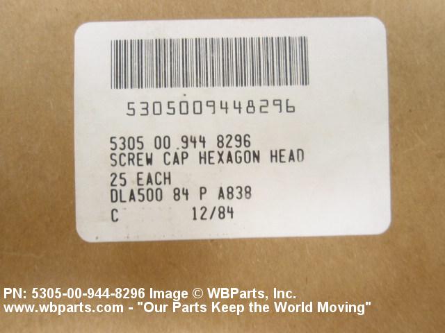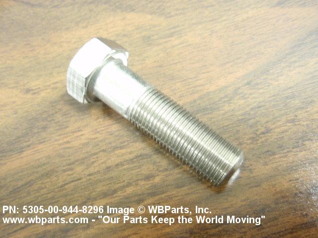 5305-00-944-8296 An externally threaded fastener designed for insertion into holes in assembled parts, for mating with a preformed internal thread and for tightening or releasing by torquing the head. The threaded and unthreaded portions are both of the same nominal diameter of 0.190 inch (5 mm) or larger. Head dimensions and sizes of threaded and unthreaded portions shall conform to internationally recognized fastener standards. The thread length being the controlled dimension, the grip length is not specified. A locking feature may be incorporated in the design of the head or threads. The head is not designed to be held or driven with an inserted driver or by the thumb and fingers. Excludes BOLT,MACHINE; BOLT,EXTERNALLY RELIEVED BODY; BOLT,INTERNAL WRENCHING; and SCREW,CAP,SOCKET HEAD.