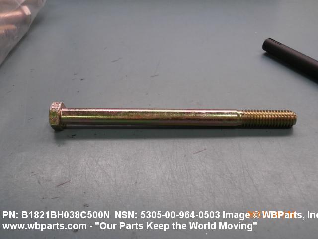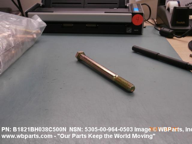 5305-00-964-0503 An externally threaded fastener designed for insertion into holes in assembled parts, for mating with a preformed internal thread and for tightening or releasing by torquing the head. The threaded and unthreaded portions are both of the same nominal diameter of 0.190 inch (5 mm) or larger. Head dimensions and sizes of threaded and unthreaded portions shall conform to internationally recognized fastener standards. The thread length being the controlled dimension, the grip length is not specified. A locking feature may be incorporated in the design of the head or threads. The head is not designed to be held or driven with an inserted driver or by the thumb and fingers. Excludes BOLT,MACHINE; BOLT,EXTERNALLY RELIEVED BODY; BOLT,INTERNAL WRENCHING; and SCREW,CAP,SOCKET HEAD.