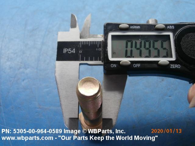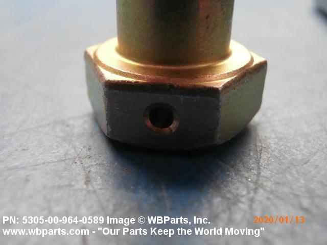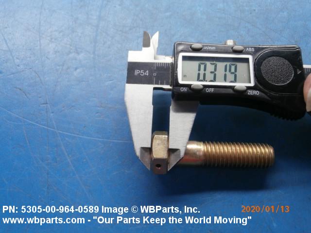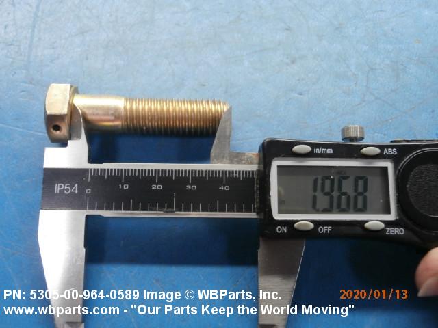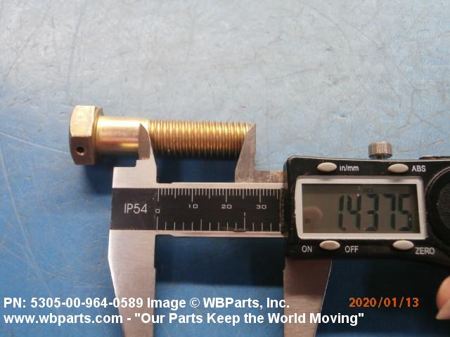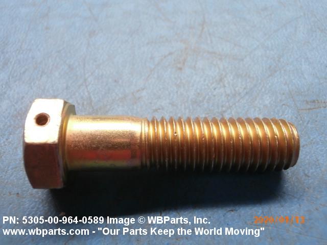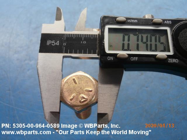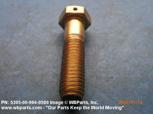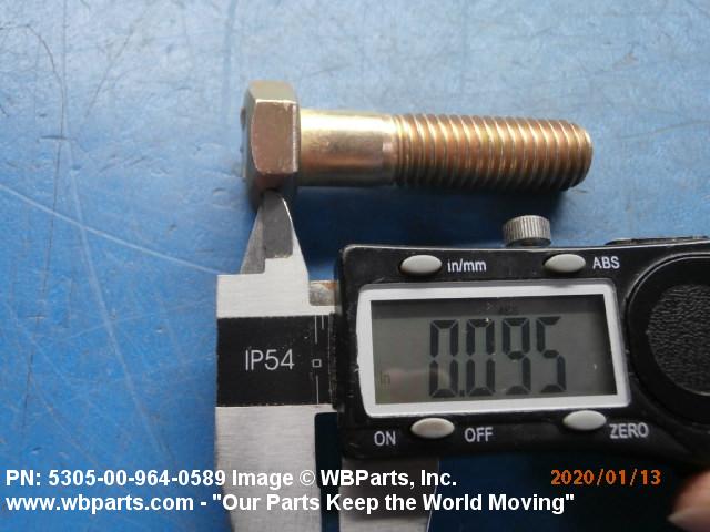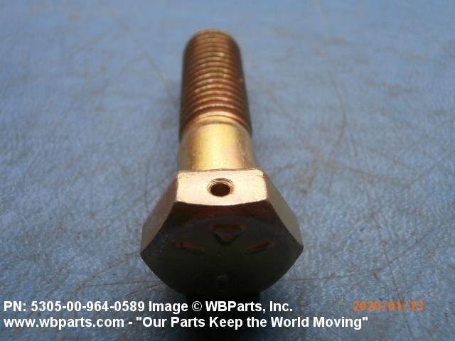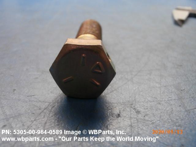 5305-00-964-0589 An externally threaded fastener designed for insertion into holes in assembled parts, for mating with a preformed internal thread and for tightening or releasing by torquing the head. The threaded and unthreaded portions are both of the same nominal diameter of 0.190 inch (5 mm) or larger. Head dimensions and sizes of threaded and unthreaded portions shall conform to internationally recognized fastener standards. The thread length being the controlled dimension, the grip length is not specified. A locking feature may be incorporated in the design of the head or threads. The head is not designed to be held or driven with an inserted driver or by the thumb and fingers. Excludes BOLT,MACHINE; BOLT,EXTERNALLY RELIEVED BODY; BOLT,INTERNAL WRENCHING; and SCREW,CAP,SOCKET HEAD.