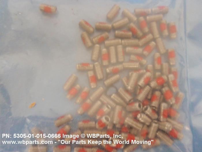 5305-01-015-0666 An externally threaded device whose threaded portion is of one nominal diameter with or without a head and having a cup, cone, or other type of machined point designed to prevent or restrict relative movement of parts and designed to be driven with either a wrench or inserted driver. A locking feature may be incorporated in the design of the head or threads.