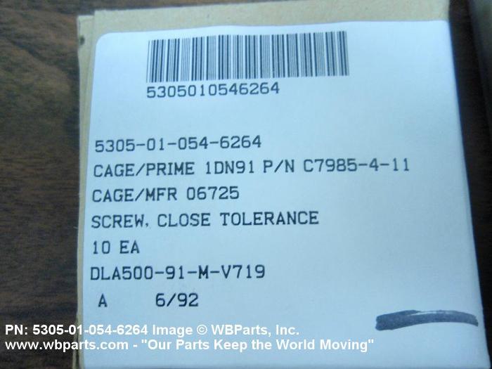 5305-01-054-6264 A SCREW, MACHINE or SCREW, CAP, SOCKET HEAD whose unthreaded portion is of specified grip length, plated or unplated, and is machined to a tolerance of one thousandth (0.001 IN.) (0.025 mm) or less of a specific diameter for items (1.000 IN.) (25 mm) or less in diameter. Items over (1.000 IN.) (25 mm) in diameter shall have a tolerance of fifteen ten thousandths (0.0015 IN.) (0.038 mm) or less. The nominal major diameter of the threads shall be at least one thousandth (0.001 IN.) (0.025 mm) below the minimum shank diameter, but not below the minimum major diameter for applicable class of fit, as shown in the Screw Thread Standards, FED STD H28 and/or other nationally recognized standards. The head is designed to be held or driven with an inserted driver. It is not designed for rotation by the thumb and fingers. A locking feature may be incorporated in the design of the head or threads.