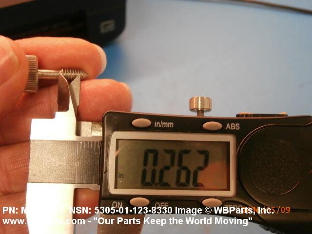5305-01-123-8330 An externally threaded fastener whose threaded portion is of one nominal diameter. It may have an unthreaded portion with a diameter less than, equal to, or greater than the diameter of the threaded portion. It has either a vertically flattened, circular knurled, or wing type head, all of which are designed for rotation by the thumb and fingers. For items having wrenching facilities such as socket recess, multiple spline or slot heads, use SCREW (as modified) or BOLT (as modified).