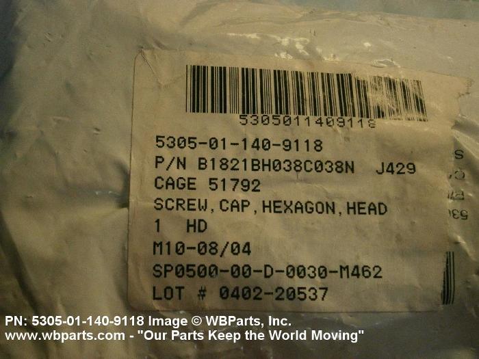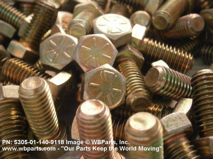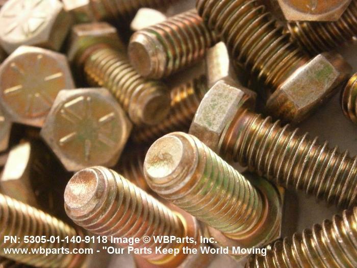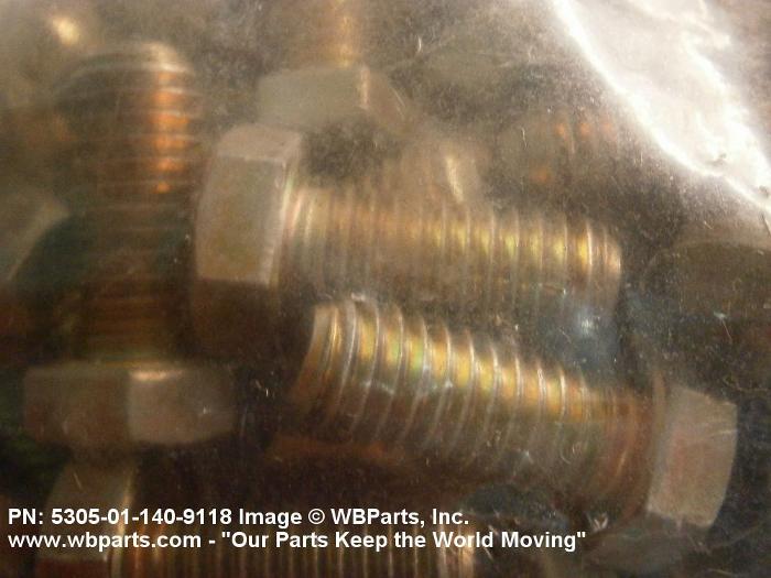 5305-01-140-9118 An externally threaded fastener designed for insertion into holes in assembled parts, for mating with a preformed internal thread and for tightening or releasing by torquing the head. The threaded and unthreaded portions are both of the same nominal diameter of 0.190 inch (5 mm) or larger. Head dimensions and sizes of threaded and unthreaded portions shall conform to internationally recognized fastener standards. The thread length being the controlled dimension, the grip length is not specified. A locking feature may be incorporated in the design of the head or threads. The head is not designed to be held or driven with an inserted driver or by the thumb and fingers. Excludes BOLT,MACHINE; BOLT,EXTERNALLY RELIEVED BODY; BOLT,INTERNAL WRENCHING; and SCREW,CAP,SOCKET HEAD.