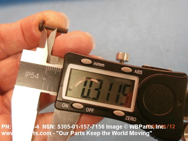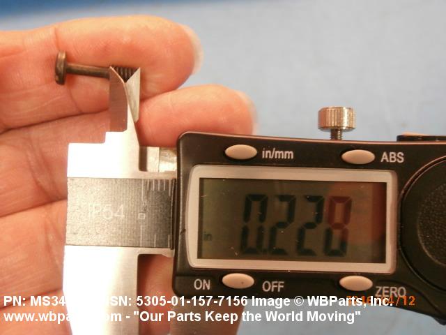 5305-01-157-7156 An externally threaded fastener whose threaded portion is of one nominal diameter, and whose unthreaded portion has been machined or ground in one or more places or over its entire length to a maximum diameter less than the minimum pitch diameter of the thread (excludes undercut for thread relief). It is No. 0 (0.060 IN.) (1.5 mm) or larger, and is designed to be held or driven with either a wrench or inserted driver (excluding internal socket and multiple spline types) or both in sizes below No. 10 (0.190 IN.) (5 mm) and larger sizes must have a head designed for any type inserted driver (excluding internal socket and multiple spline types) but may also be designed for external wrenching. A locking feature may be incorporated in the design of the head or threads. See also BOLT, EXTERNALLY RELIEVED BODY and BOLT, INTERNAL WRENCHING.