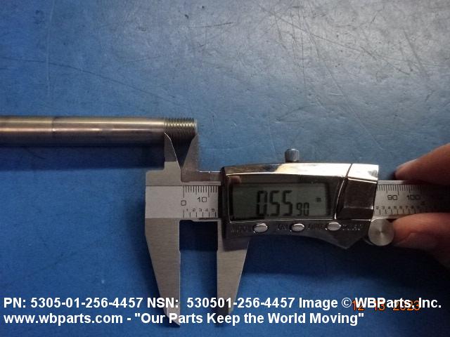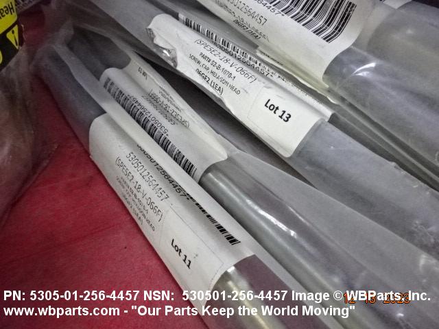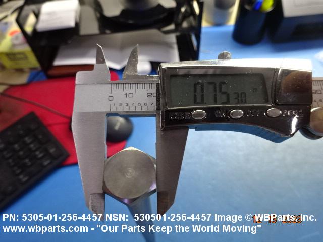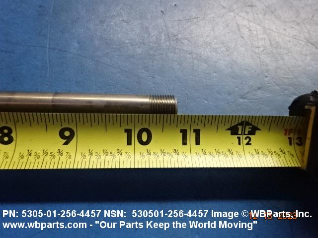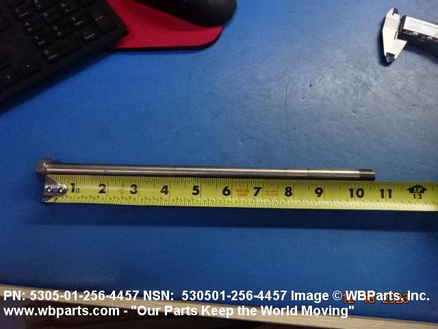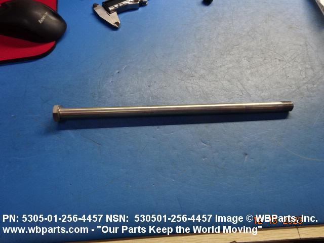 5305-01-256-4457 An externally threaded fastener designed for insertion into holes in assembled parts, for mating with a preformed internal thread and for tightening or releasing by torquing the head. The threaded and unthreaded portions are both of the same nominal diameter of 0.190 inch (5 mm) or larger. Head dimensions and sizes of threaded and unthreaded portions shall conform to internationally recognized fastener standards. The thread length being the controlled dimension, the grip length is not specified. A locking feature may be incorporated in the design of the head or threads. The head is not designed to be held or driven with an inserted driver or by the thumb and fingers. Excludes BOLT,MACHINE; BOLT,EXTERNALLY RELIEVED BODY; BOLT,INTERNAL WRENCHING; and SCREW,CAP,SOCKET HEAD.