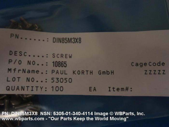 NSN 5305-01-340-4114 BN650 M3X8, BN650M3X8, DIN85M3X8
