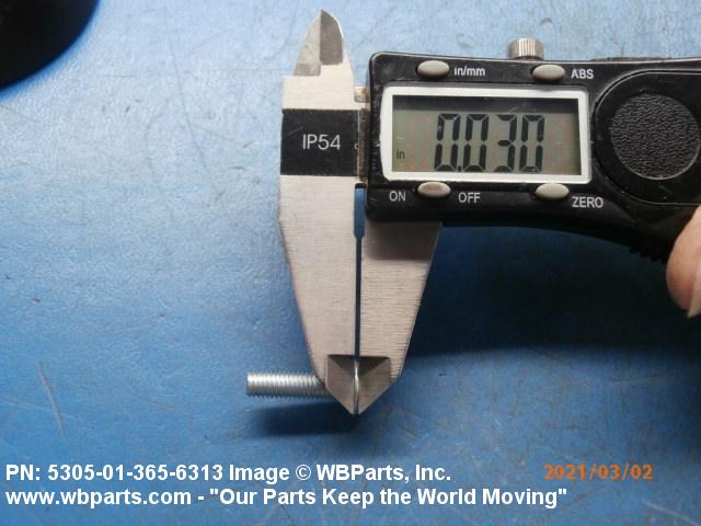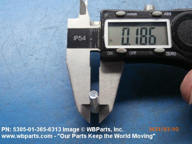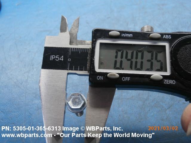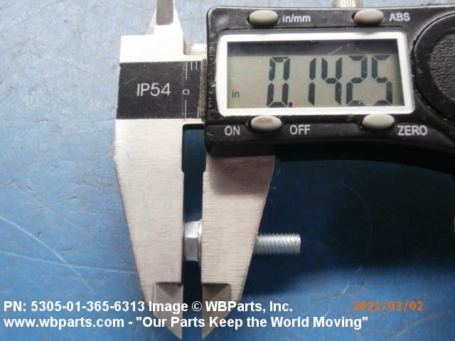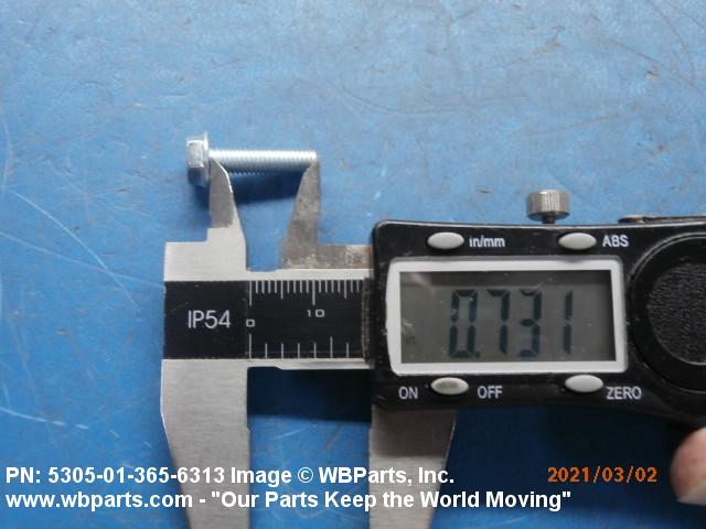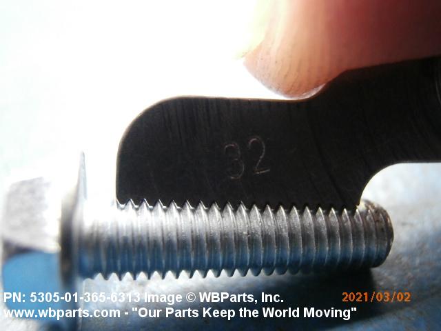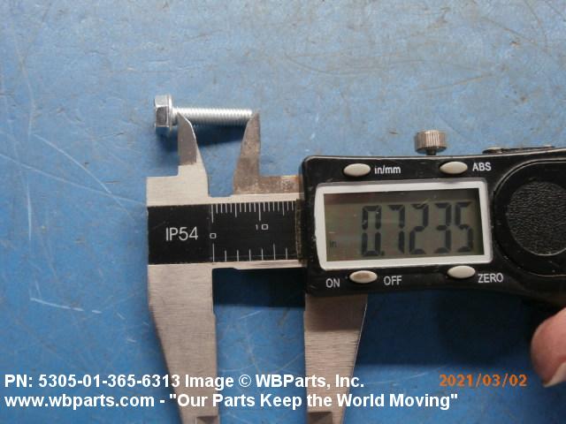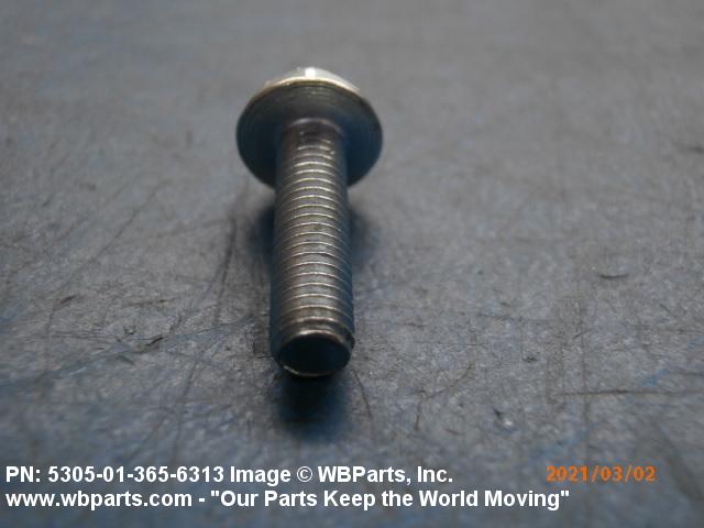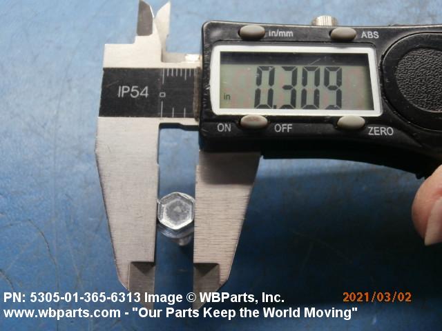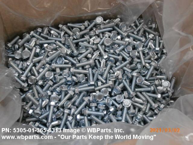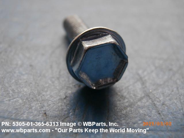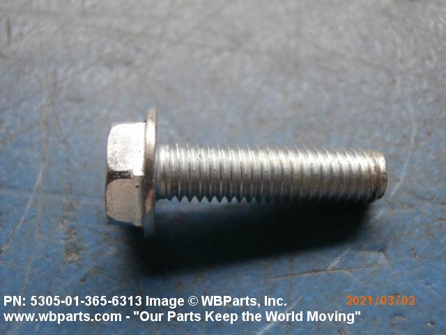 5305-01-365-6313 An externally threaded fastener designed for insertion into holes in assembled parts, for mating with a preformed internal thread and for tightening or releasing by torquing the head. The threaded and unthreaded portions are both of the same nominal diameter of 0.190 inch (5 mm) or larger. Head dimensions and sizes of threaded and unthreaded portions shall conform to internationally recognized fastener standards. The thread length being the controlled dimension, the grip length is not specified. A locking feature may be incorporated in the design of the head or threads. The head is not designed to be held or driven with an inserted driver or by the thumb and fingers. Excludes BOLT,MACHINE; BOLT,EXTERNALLY RELIEVED BODY; BOLT,INTERNAL WRENCHING; and SCREW,CAP,SOCKET HEAD.