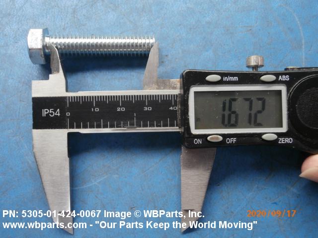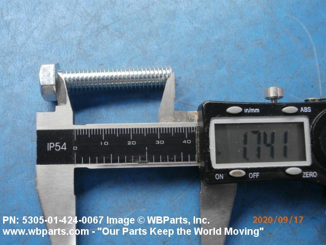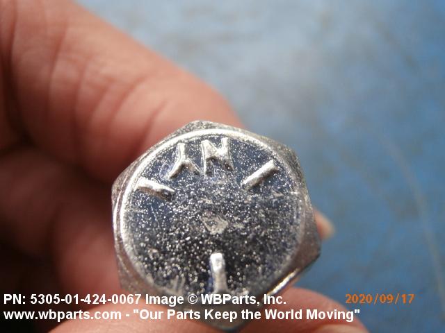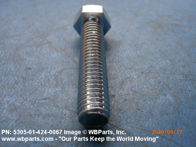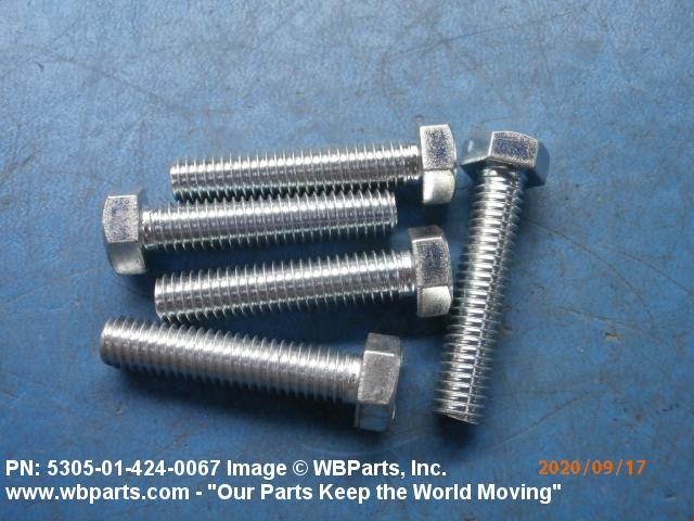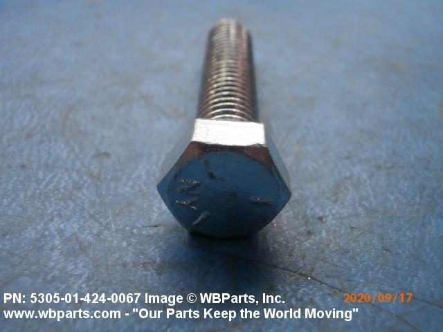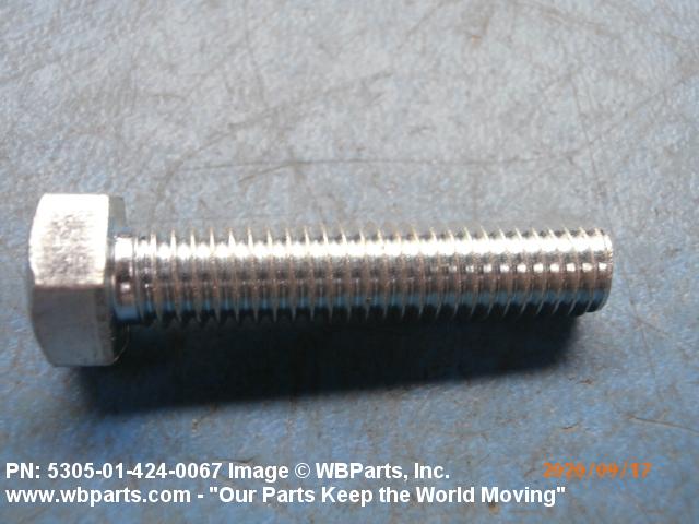 5305-01-424-0067 An externally threaded fastener whose threaded portion is of one nominal diameter, No 0 (0.060 in./1.5 mm) or larger, designed to be held or driven with either a wrench or an inserted driver or both (excluding internal socket or internal multiple spline types), in sizes below No. 10 (0.190 in./5 mm). No. 10 and larger sizes must have a head designed for any type inserted driver (excluding internal socket or internal multiple spline types), but may also be designed for external wrenching. A locking feature may be incorporated in the design of the head or threads. Excludes BOLT, CLEVIS; BOLT, EXTERNALLY RELIEVED BODY; SCREW, EXTERNALLY RELIEVED BODY; and SCREW, ASSEMBLED WASHER. See also, SCREW, INSTRUMENT; BOLT, MACHINE; BOLT, INTERNAL WRENCHING; and SCREW, CAP SOCKET HEAD.
