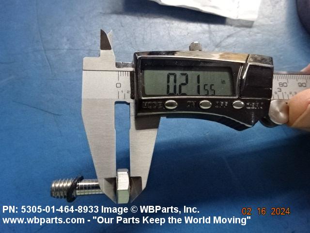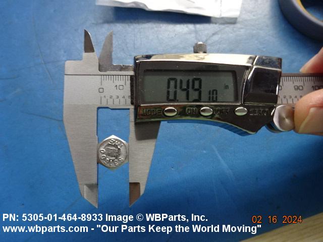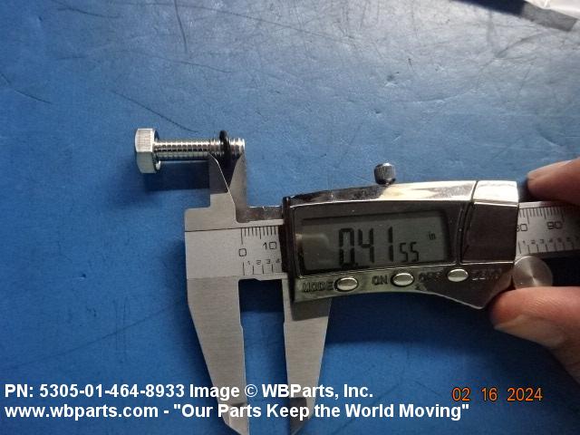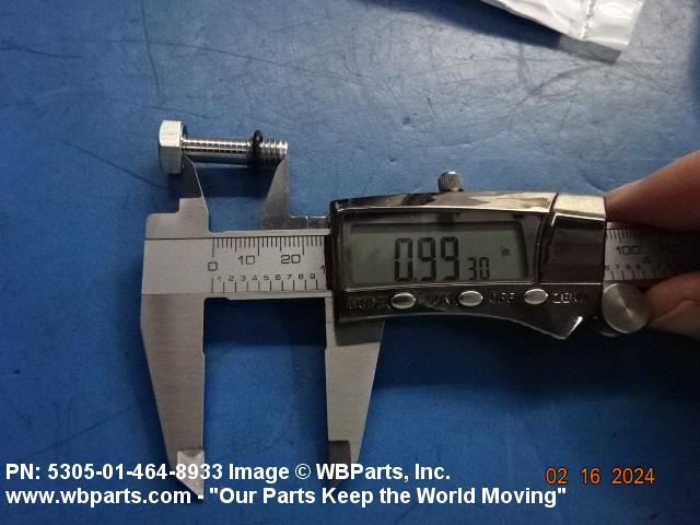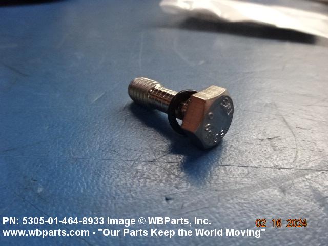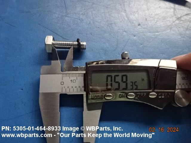 5305-01-464-8933 An externally threaded fastener whose threaded portion is of one nominal diameter, No 0 (0.060 in./1.5 mm) or larger, designed to be held or driven with either a wrench or an inserted driver or both (excluding internal socket or internal multiple spline types), in sizes below No. 10 (0.190 in./5 mm). No. 10 and larger sizes must have a head designed for any type inserted driver (excluding internal socket or internal multiple spline types), but may also be designed for external wrenching. A locking feature may be incorporated in the design of the head or threads. Excludes BOLT, CLEVIS; BOLT, EXTERNALLY RELIEVED BODY; SCREW, EXTERNALLY RELIEVED BODY; and SCREW, ASSEMBLED WASHER. See also, SCREW, INSTRUMENT; BOLT, MACHINE; BOLT, INTERNAL WRENCHING; and SCREW, CAP SOCKET HEAD.