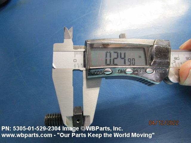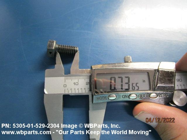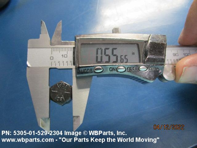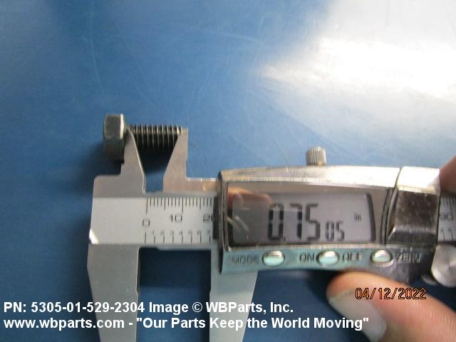 5305-01-529-2304 An externally threaded fastener designed for insertion into holes in assembled parts, for mating with a preformed internal thread and for tightening or releasing by torquing the head. The threaded and unthreaded portions are both of the same nominal diameter of 0.190 inch (5 mm) or larger. Head dimensions and sizes of threaded and unthreaded portions shall conform to internationally recognized fastener standards. The thread length being the controlled dimension, the grip length is not specified. A locking feature may be incorporated in the design of the head or threads. The head is not designed to be held or driven with an inserted driver or by the thumb and fingers. Excludes BOLT,MACHINE; BOLT,EXTERNALLY RELIEVED BODY; BOLT,INTERNAL WRENCHING; and SCREW,CAP,SOCKET HEAD.