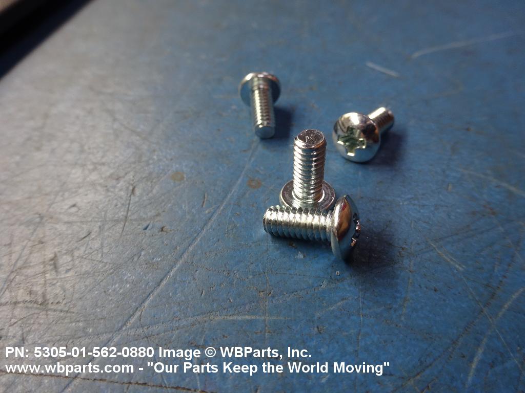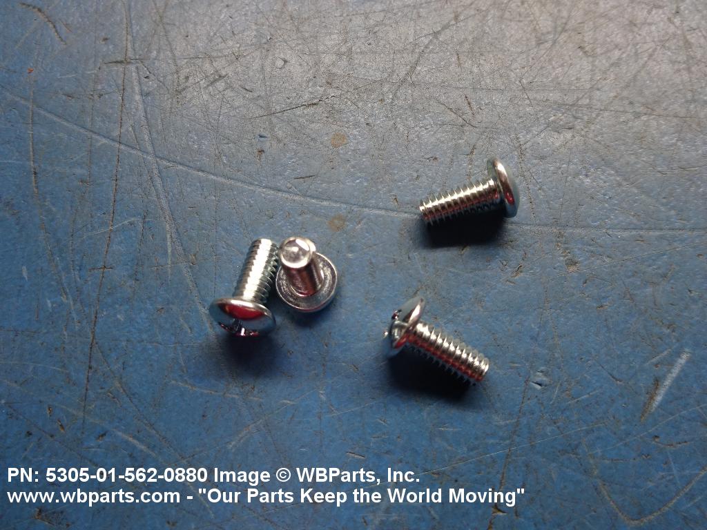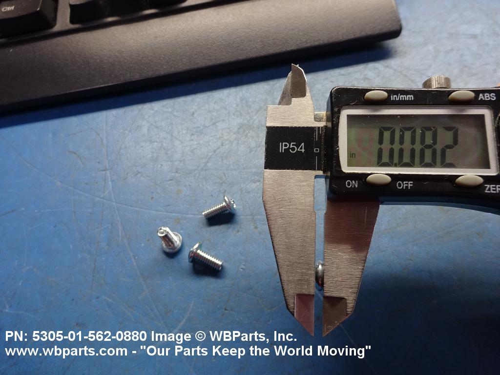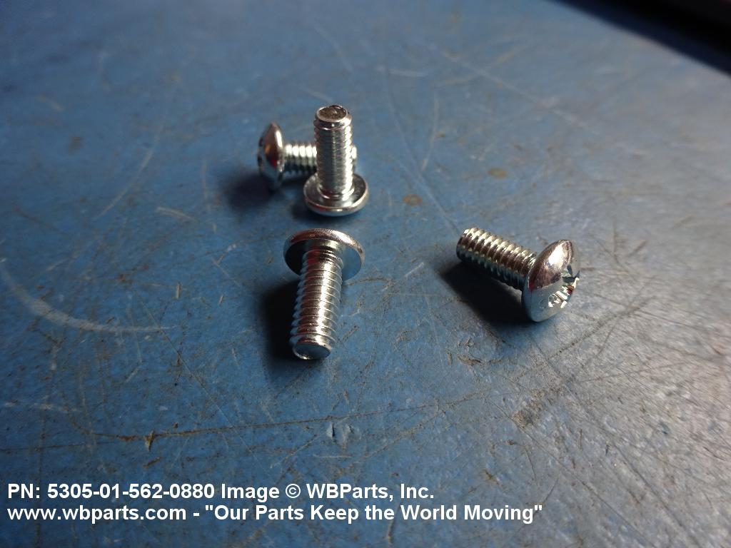 5305-01-562-0880 An externally threaded fastener whose threaded portion is of one nominal diameter, No 0 (0.060 in./1.5 mm) or larger, designed to be held or driven with either a wrench or an inserted driver or both (excluding internal socket or internal multiple spline types), in sizes below No. 10 (0.190 in./5 mm). No. 10 and larger sizes must have a head designed for any type inserted driver (excluding internal socket or internal multiple spline types), but may also be designed for external wrenching. A locking feature may be incorporated in the design of the head or threads. Excludes BOLT, CLEVIS; BOLT, EXTERNALLY RELIEVED BODY; SCREW, EXTERNALLY RELIEVED BODY; and SCREW, ASSEMBLED WASHER. See also, SCREW, INSTRUMENT; BOLT, MACHINE; BOLT, INTERNAL WRENCHING; and SCREW, CAP SOCKET HEAD.