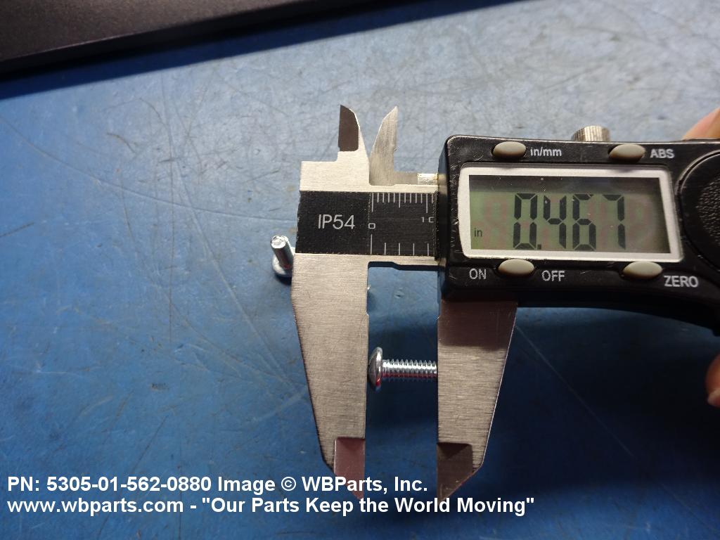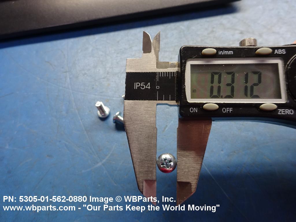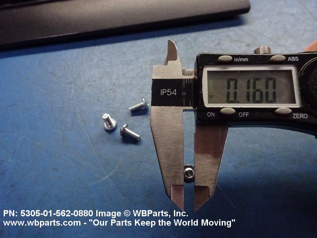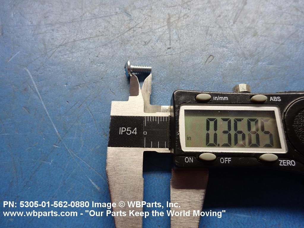 5305-01-562-0880 An externally threaded fastener whose threaded portion is of one nominal diameter, No 0 (0.060 in./1.5 mm) or larger, designed to be held or driven with either a wrench or an inserted driver or both (excluding internal socket or internal multiple spline types), in sizes below No. 10 (0.190 in./5 mm). No. 10 and larger sizes must have a head designed for any type inserted driver (excluding internal socket or internal multiple spline types), but may also be designed for external wrenching. A locking feature may be incorporated in the design of the head or threads. Excludes BOLT, CLEVIS; BOLT, EXTERNALLY RELIEVED BODY; SCREW, EXTERNALLY RELIEVED BODY; and SCREW, ASSEMBLED WASHER. See also, SCREW, INSTRUMENT; BOLT, MACHINE; BOLT, INTERNAL WRENCHING; and SCREW, CAP SOCKET HEAD.
