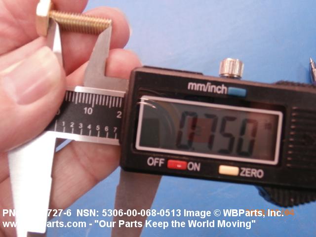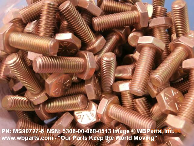 5306-00-068-0513 An externally threaded fastener designed for insertion through holes in assembled parts and normally intended to be tightened or released by torquing a nut. The threaded and unthreaded portions are both of one nominal diameter of 0.190 inch (5 mm) or larger. The head is not designed to be held or driven with an inserted driver or by the thumb and fingers. A locking feature may be incorporated in the design of the head or threads. Head dimensions and sizes of threaded and unthreaded portions shall conform to internationally recognized fastener standards. For items having a grip length portion machined to a tolerance of 0.0015 inch (0.038 mm) or less, BOLT, SHEAR. See also SCREW, CAP, HEXAGON HEAD and SCREW, MACHINE.