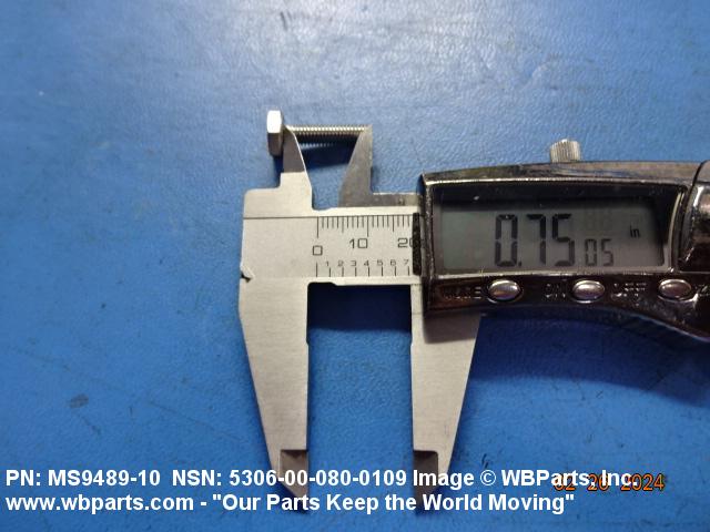 5306-00-080-0109 An externally threaded fastener designed for insertion through holes in assembled parts and normally intended to be tightened or released by torquing a nut. The threaded and unthreaded portions are both of one nominal diameter of 0.190 inch (5 mm) or larger. The head is not designed to be held or driven with an inserted driver or by the thumb and fingers. A locking feature may be incorporated in the design of the head or threads. Head dimensions and sizes of threaded and unthreaded portions shall conform to internationally recognized fastener standards. For items having a grip length portion machined to a tolerance of 0.0015 inch (0.038 mm) or less, BOLT, SHEAR. See also SCREW, CAP, HEXAGON HEAD and SCREW, MACHINE.