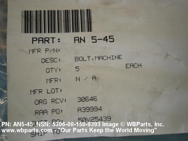 Part Alternates: AN545, AN5-45, 5306-00-150-9393, 00-150-9393, 5306001509393, 001509393